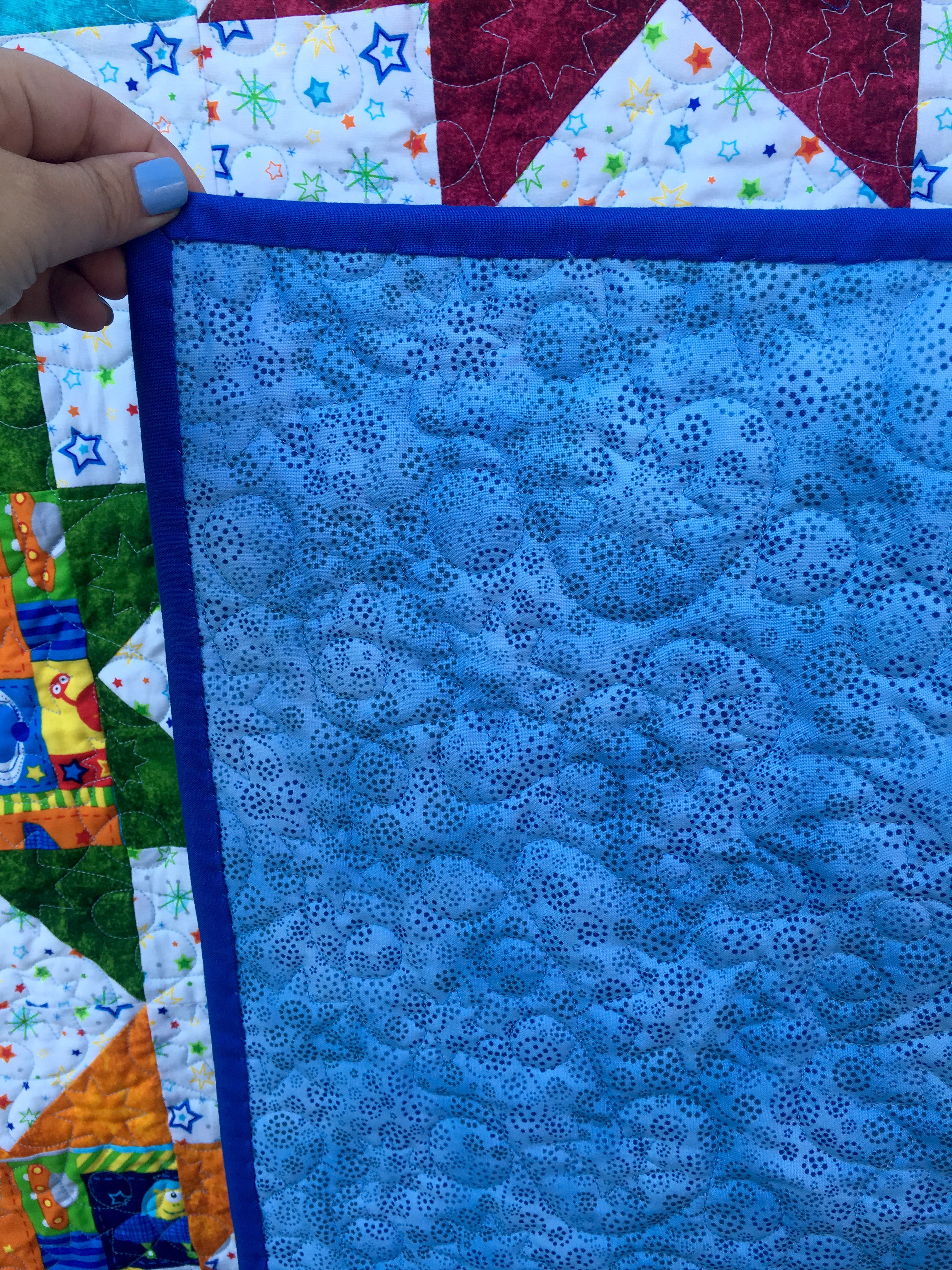 Given there is so much color on the front of this quilt, I wanted something a little more quiet for the back. This simple blue on blue print worked just fine for me, and I finished it with a solid blue binding. I really like this quilt!