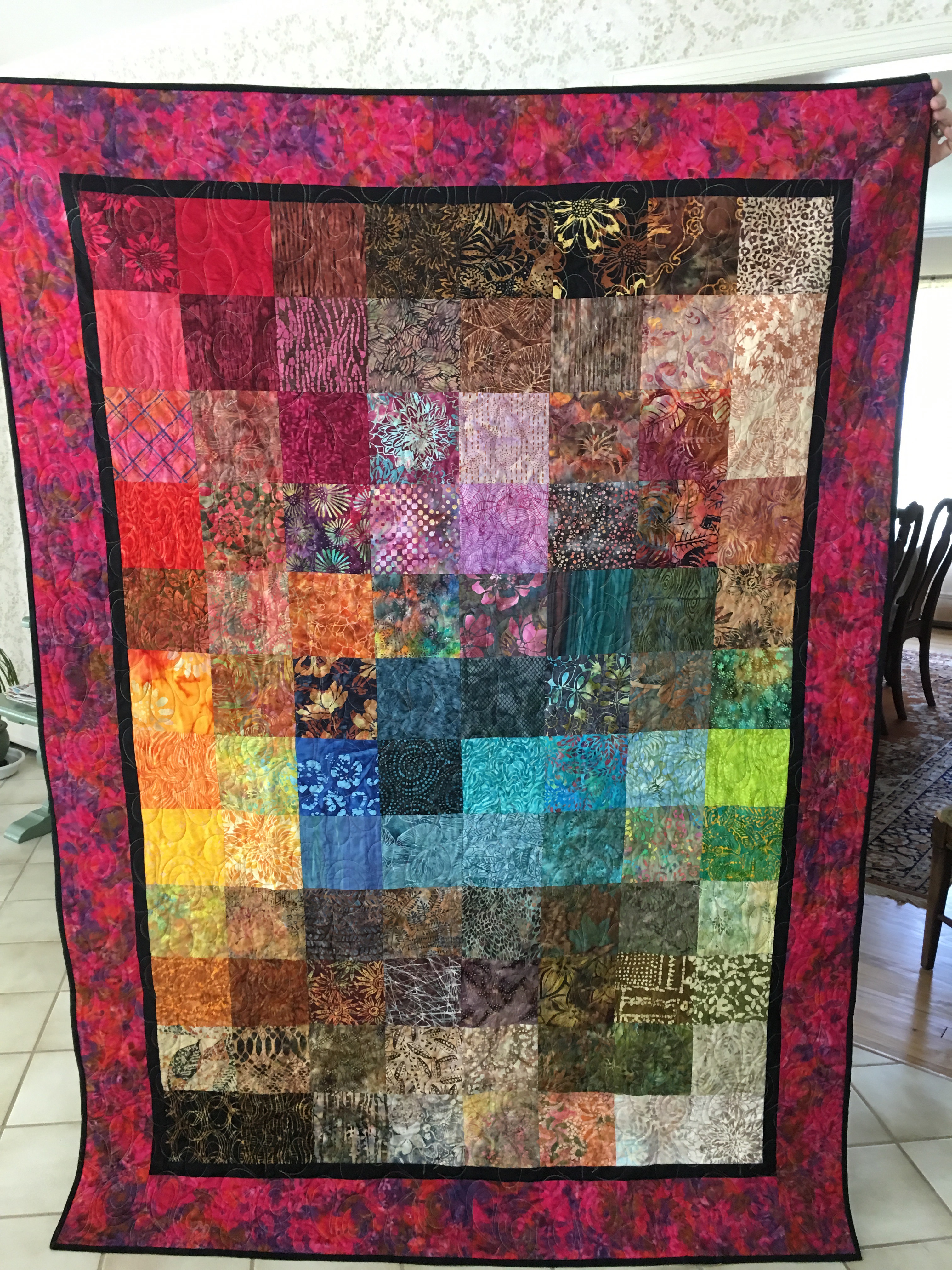I used various batiks, most bought in Barcelona this spring, but with quite a few from my travels this summer. I loved this quilt as it was going together so I cut a bunch of batiks to make another. Or two. Sophia picked the border to make sure she got that burst of color she wanted.
