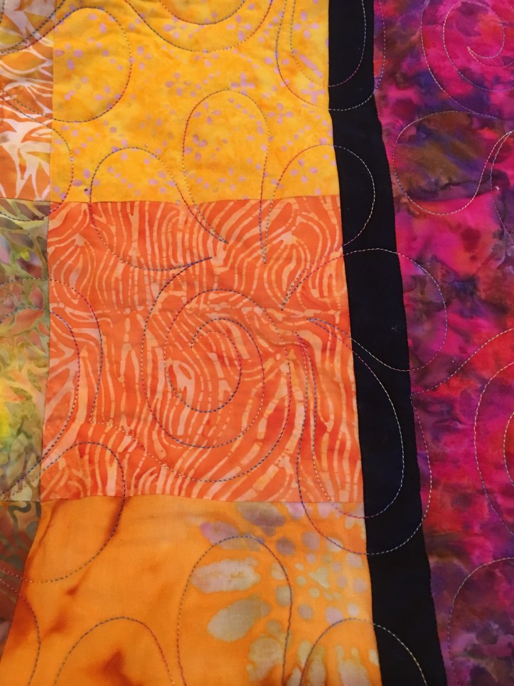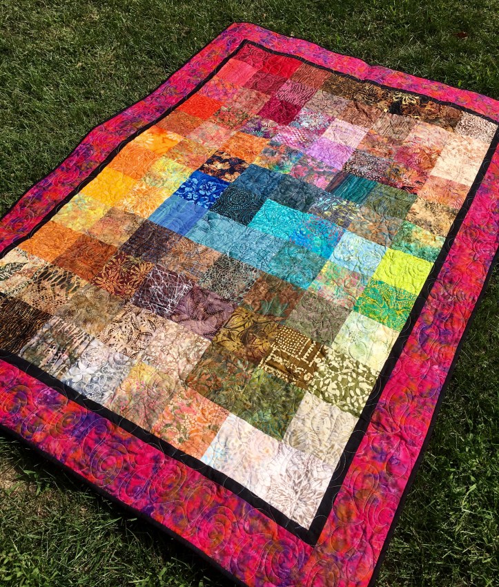 Sophia just moved into her first apartment for her junior year at University of California San Diego. When her Dad and I visited in June I offered to make her a quilt. She had mentioned that she would like something colorful, and I took her to Rosie’s Quilted Cupboard so she could pick her own border and back.