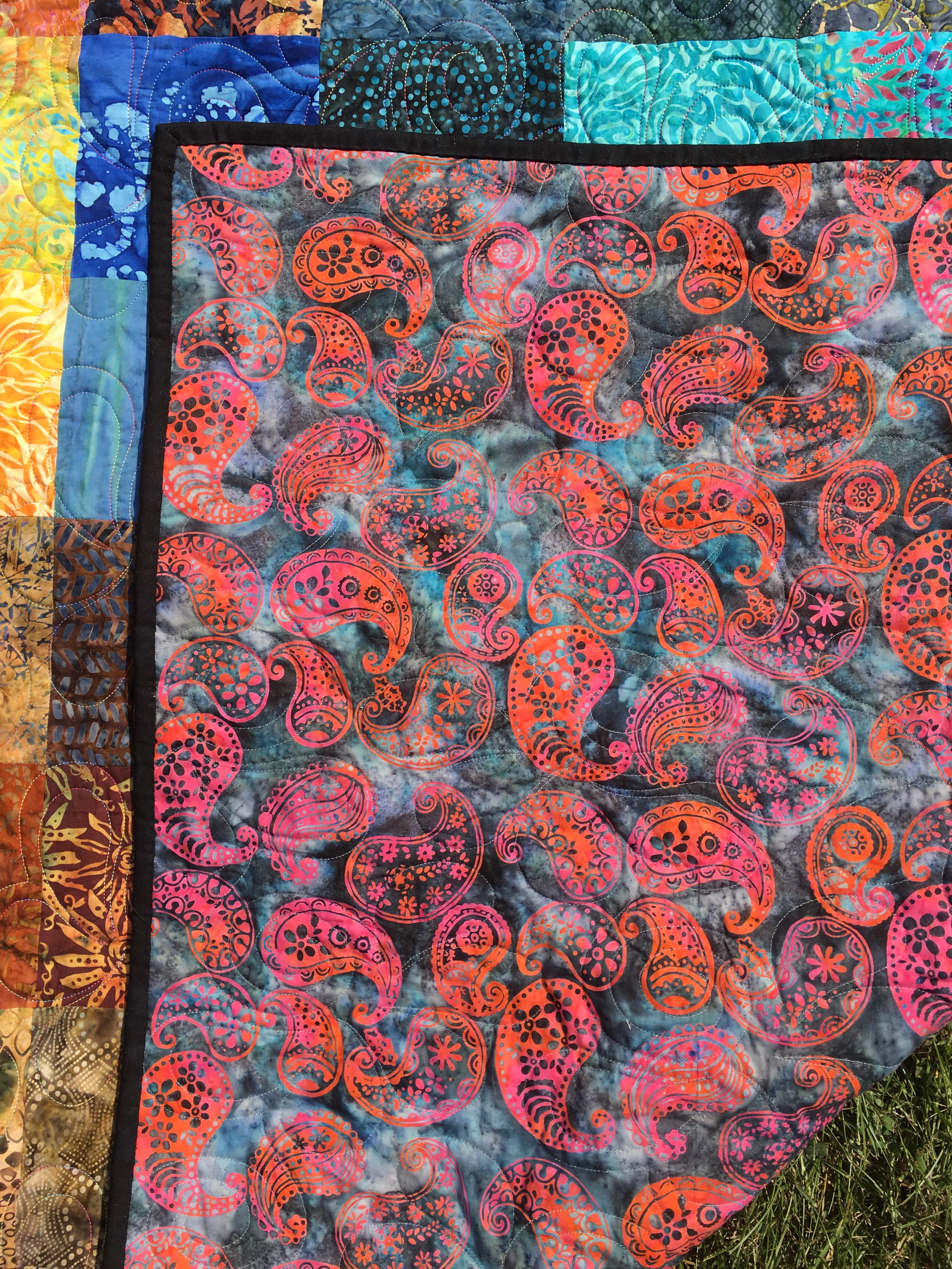 The back is a grey batik with pink and orange bandana shapes. It ties to the front border well and is a lot of fun.