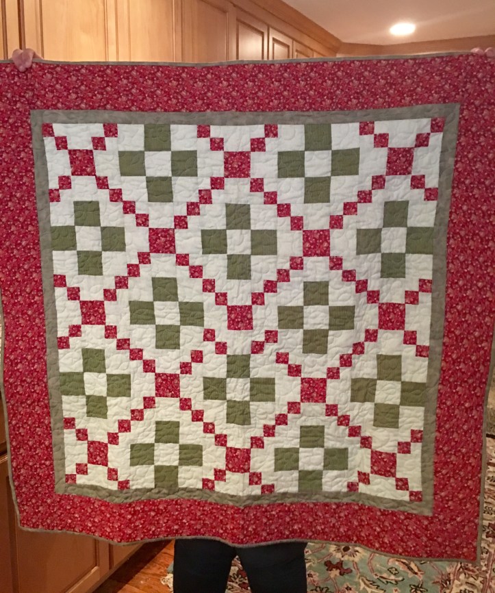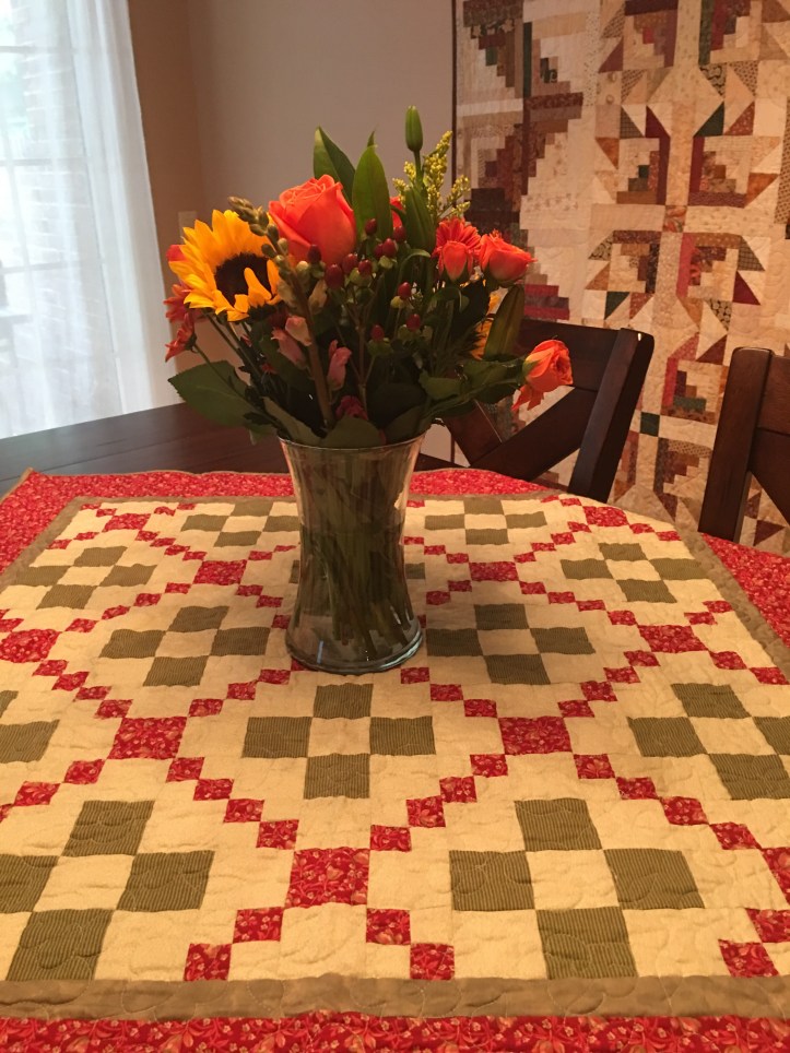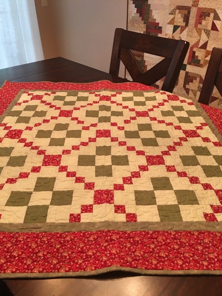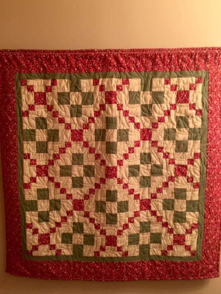 They had a shop sample of a wall hanging that I loved. I was really into denim red at the time, and lived in an old school house that had a lot of that country green in it. I bought the fabric to make the quilt and stitched the top. Before I could quilt it, a friend that I am sadly no longer in touch with, bought the shop sample for me. That quilt, shown below, has moved with me three times and is now hanging in my main level half bath.