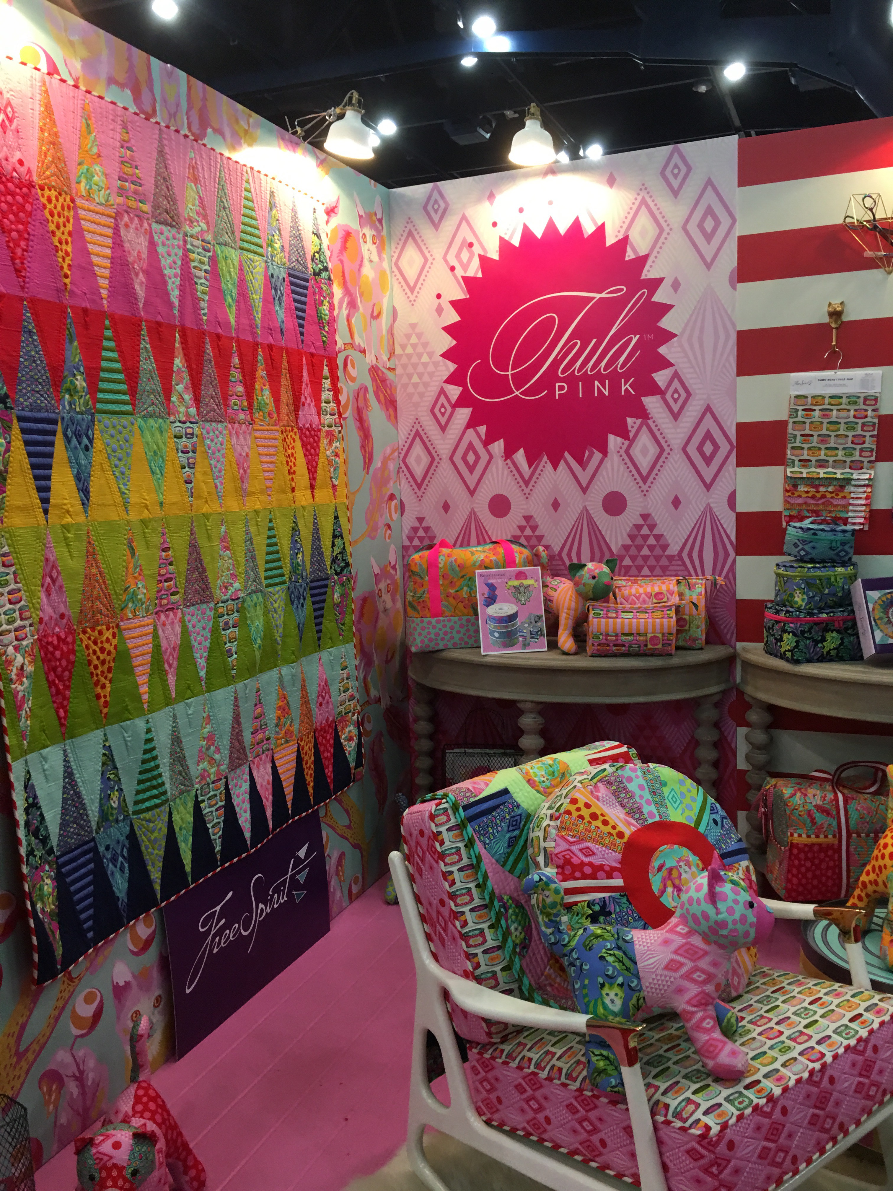 Tula Pink’s booth with Free Spirit to promote her new line was about as happy, bright and inspiring as you can get. Tula was there meeting customers and was lovely. If you like cats, or brights, or both, you will love this line.