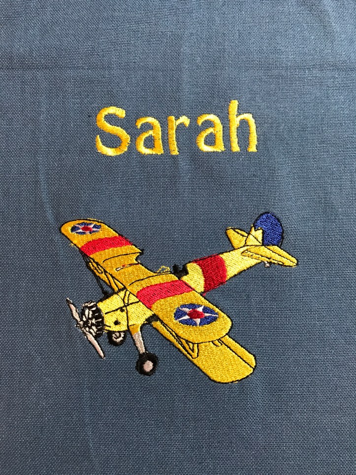 Speaking of finding cool stuff online, one lady in Warwick asked for a bi-plane. I found this design and just had to adjust the colors. It looks great on the blue apron.