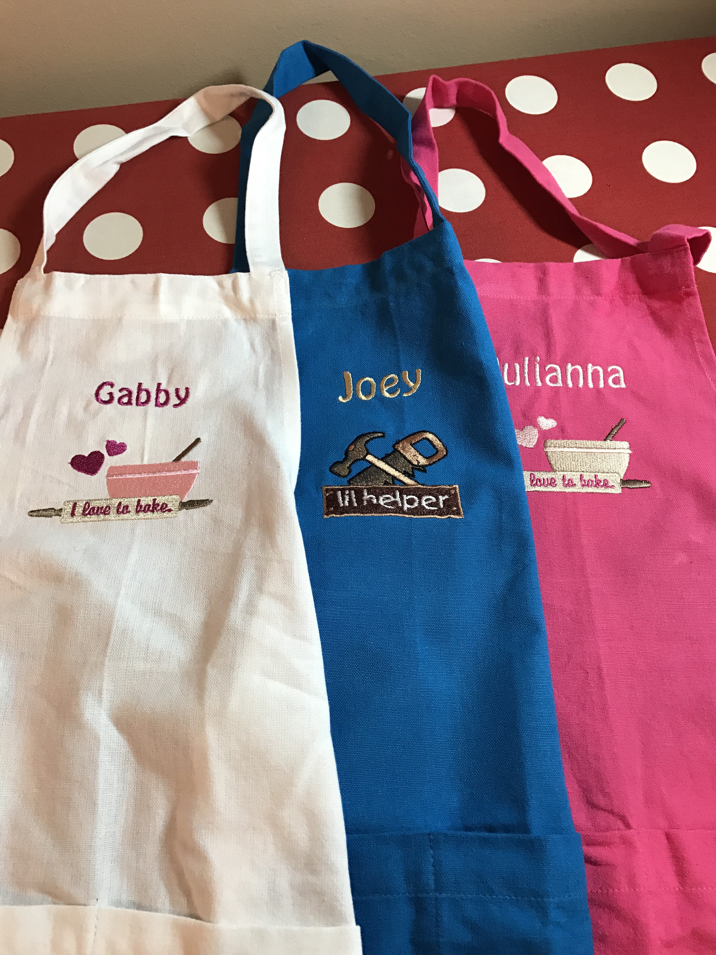 I love doing kids aprons. These three are adorable. I wish I could get a photo of my customer’s grandkids wearing them!