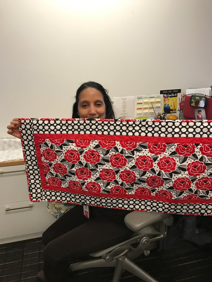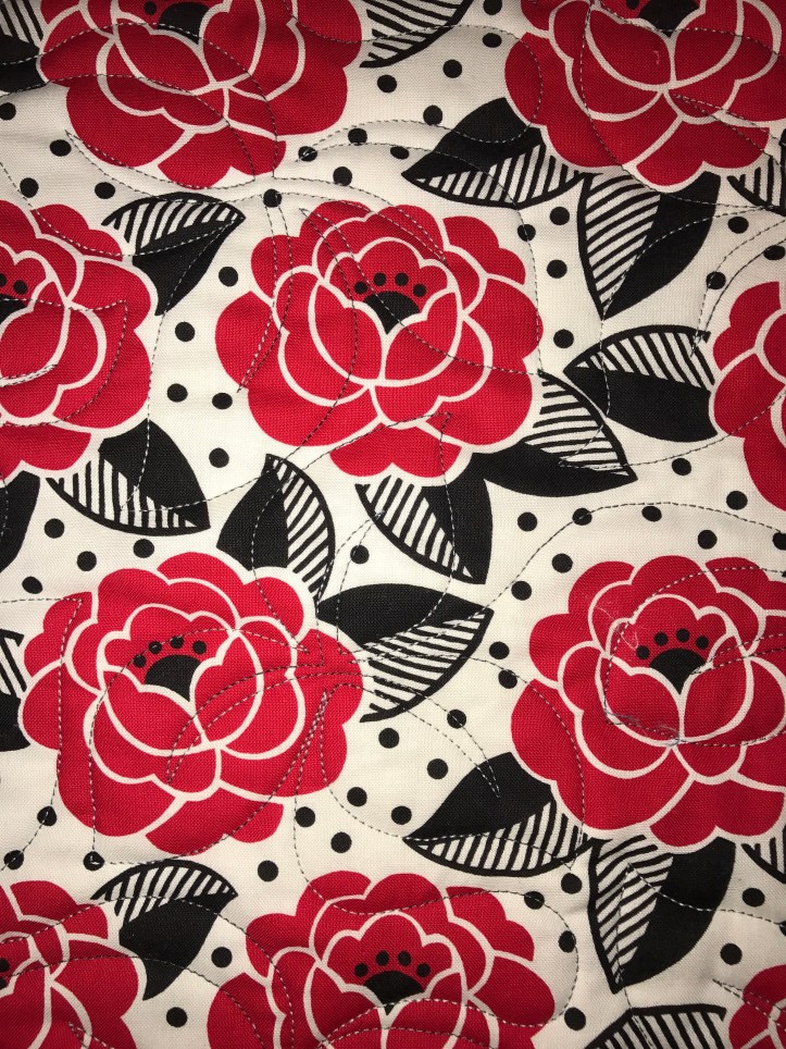 First, a table runner for my assistant at work, Lina. She asked for a black and white table runner and said red or burgundy as an accent color. I know there is more red than just an accent, but the black and white fabric I had to choose from was too masculine or too childish. Or had other colors that aren’t in her palette.