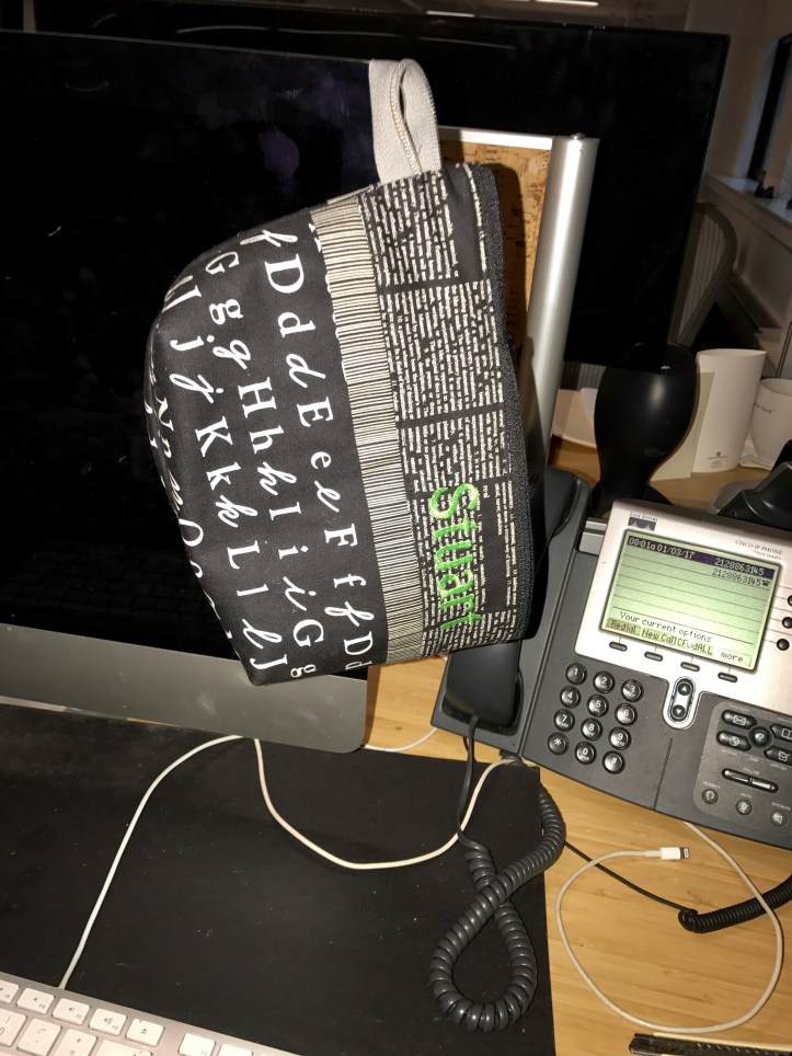 This is how I left his on his desk on our first day back today. With a note inside, of course. I like this bag in black too. This fabric was great for Stuart as he is our print production manager. I hope he likes it!