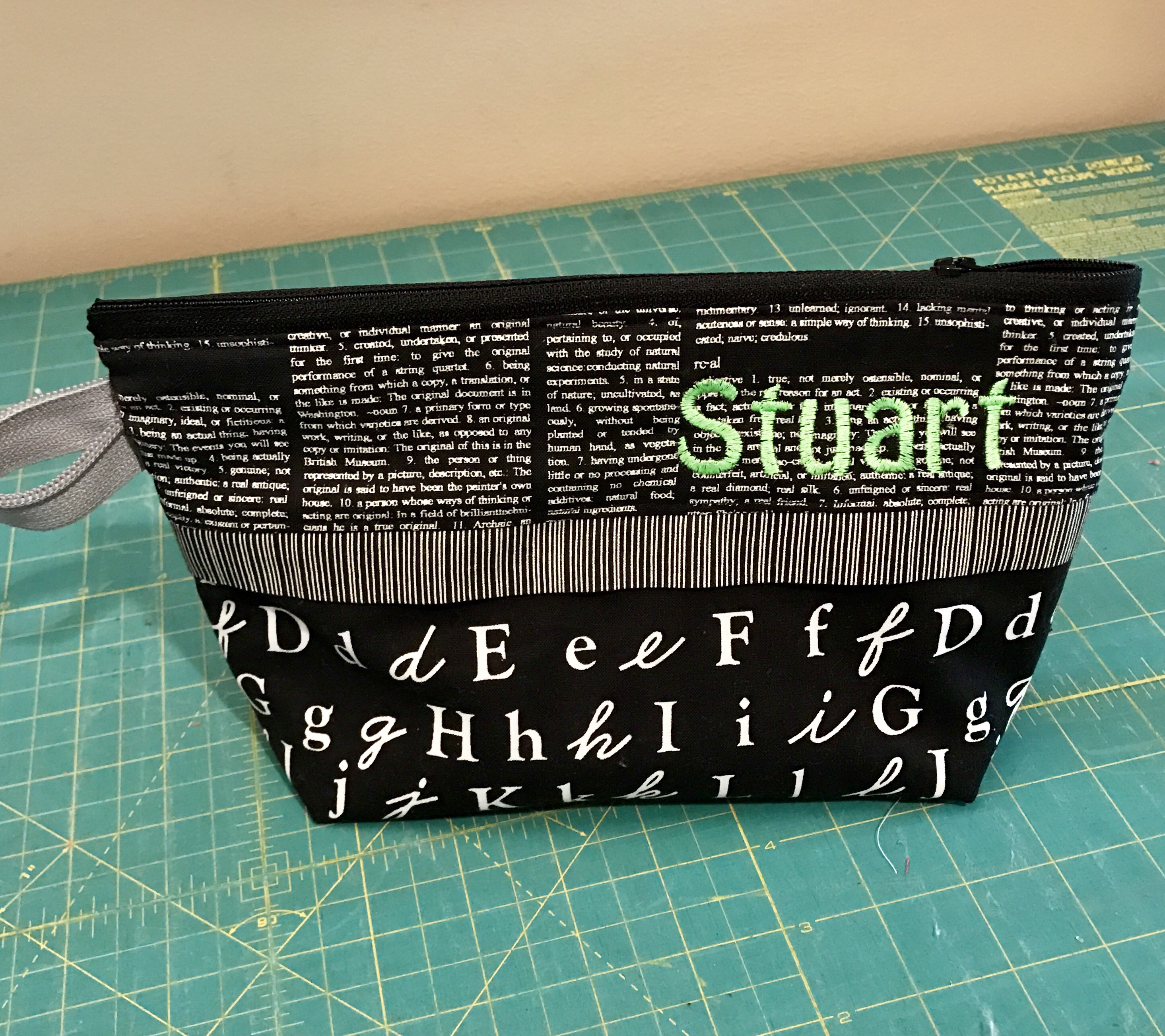 This is how I left his on his desk on our first day back today. With a note inside, of course. I like this bag in black too. This fabric was great for Stuart as he is our print production manager. I hope he likes it!