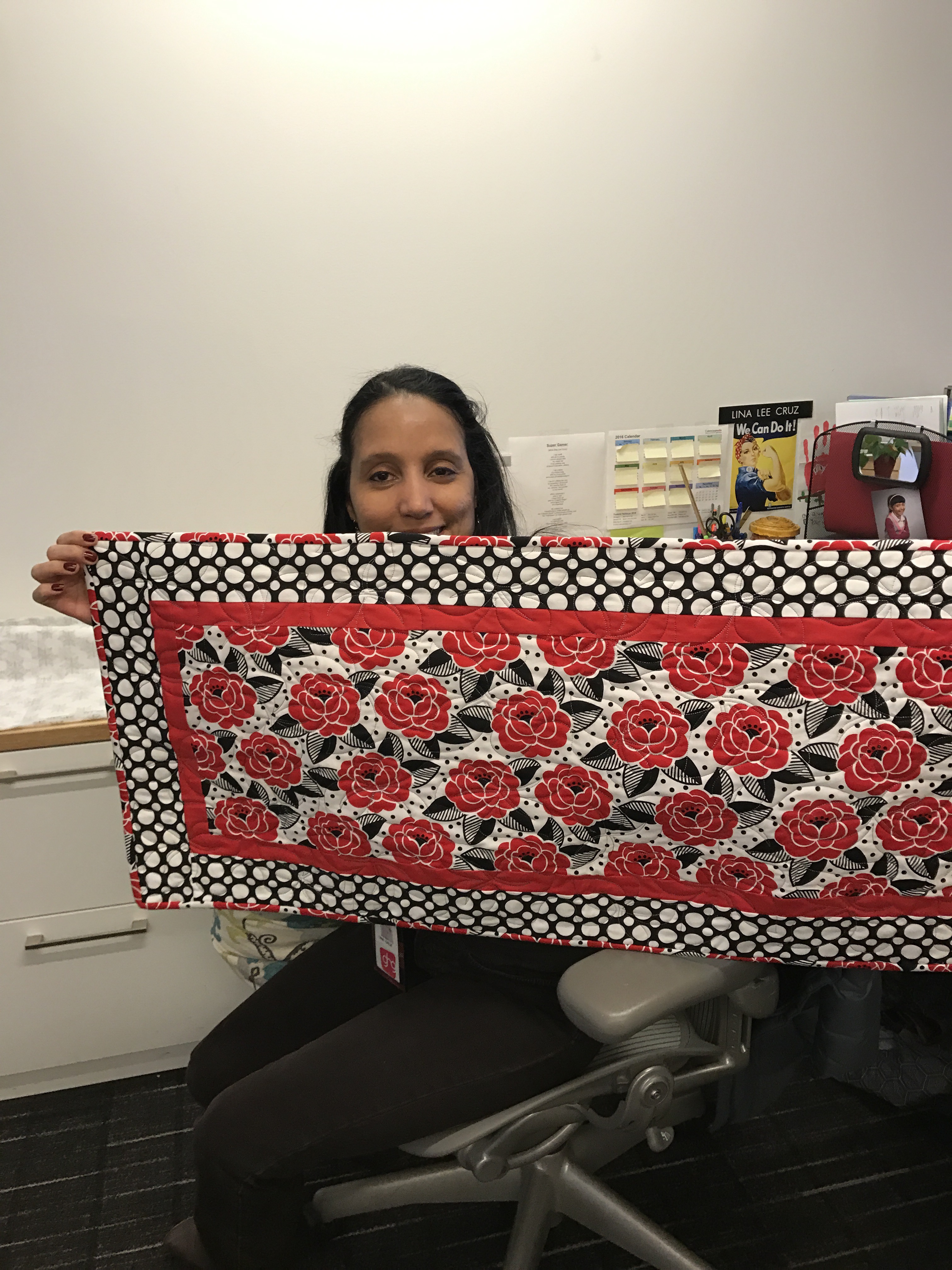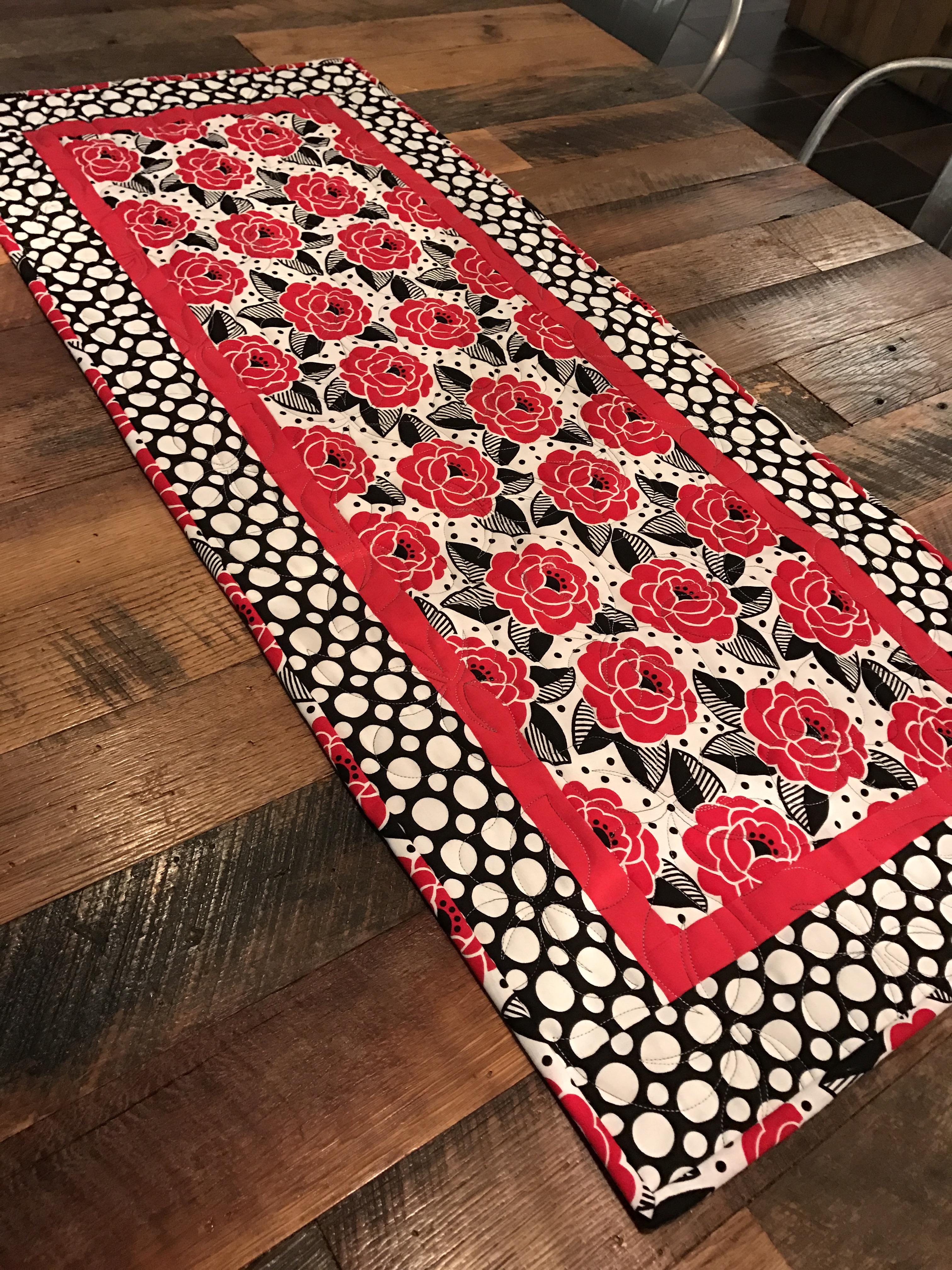 First, a table runner for my assistant at work, Lina. She asked for a black and white table runner and said red or burgundy as an accent color. I know there is more red than just an accent, but the black and white fabric I had to choose from was too masculine or too childish. Or had other colors that aren’t in her palette.