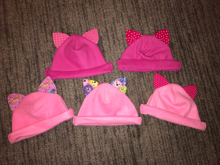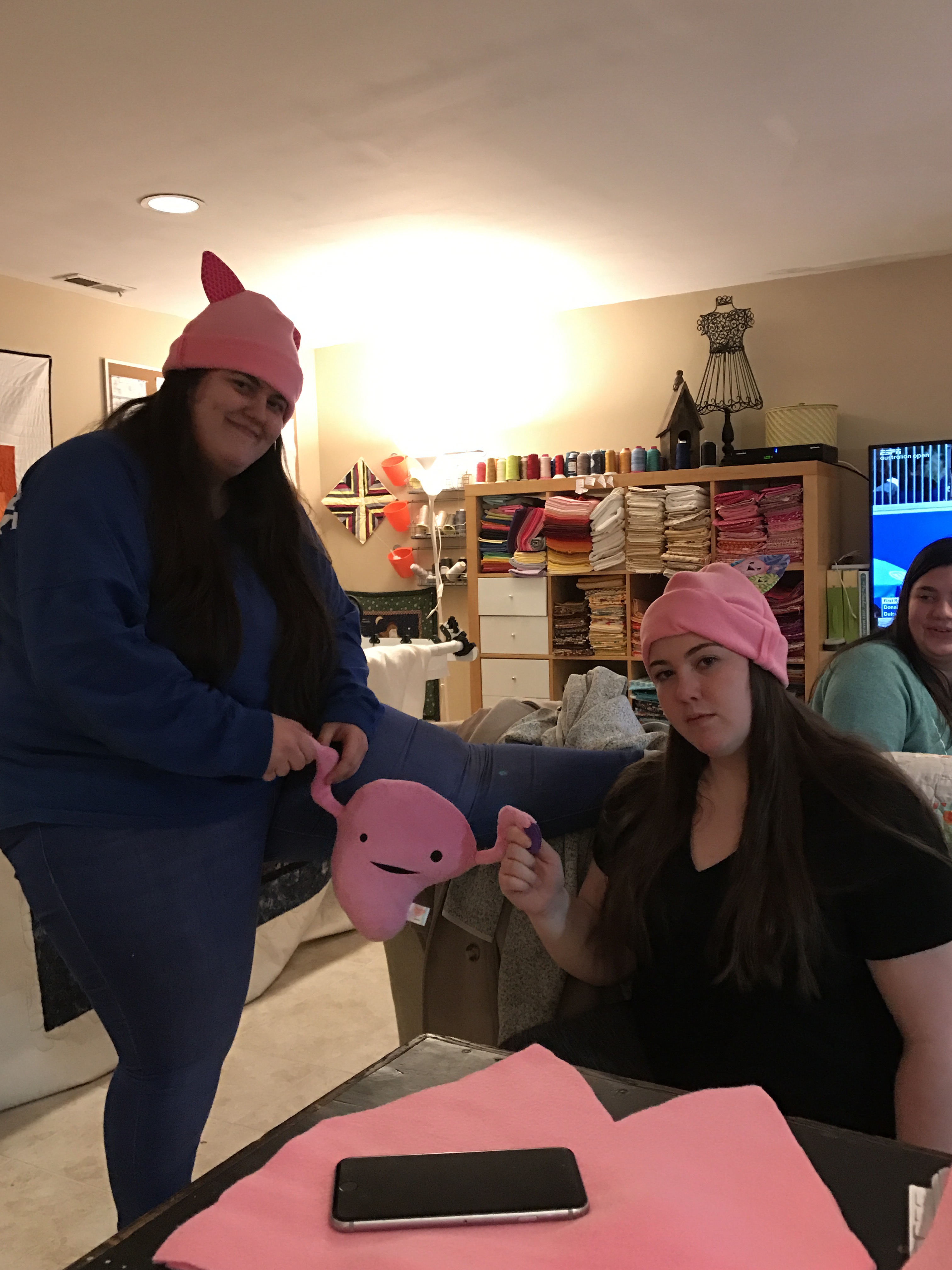 Five pussy hats later we called it a night. Each one is unique with different ears against light or dark pink fleece. We are regrouping Thursday night to make more.