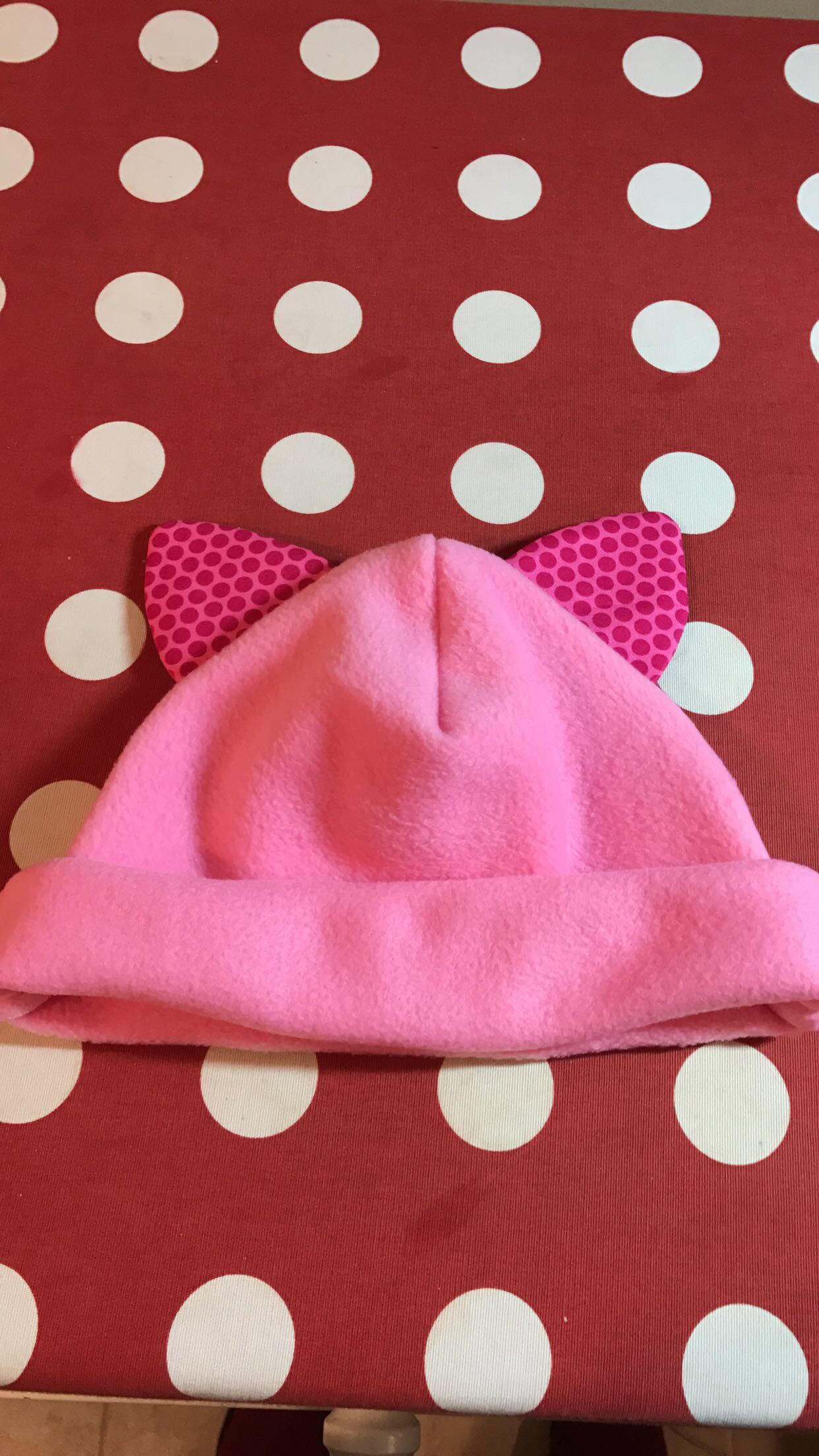 Here is pussy hat #1, fresh off our assembly line. Patty cut the fleece, I did the ears, she ironed and I sewed. We were quite productive.