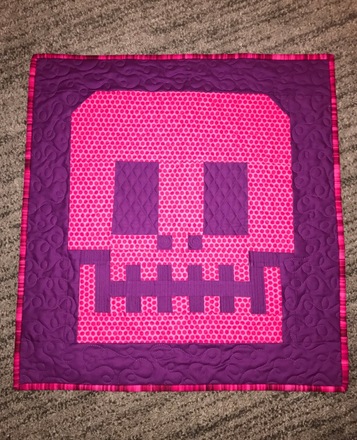 I made this mini quilt for a pink swap on Instagram but loved it so much I made one for myself. It is a sugar skull from Tula Pink’s book, Quilt with Tula and Angela. The quilt measure 29″ x 31″.