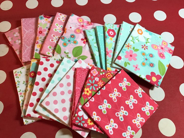 Looking at the fat quarter bundle, I spent a bit of time deciding whether to work across the palette or to do a single monochromatic color story. I went with the whole collection and cut up the whole fat quarter set so I can list it on my Etsy shop.