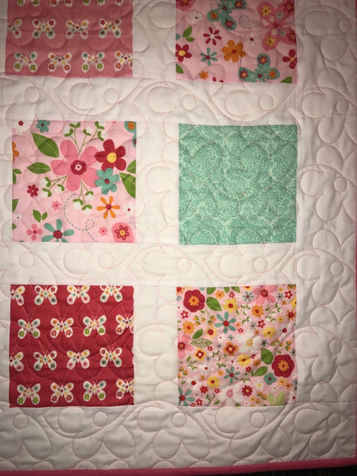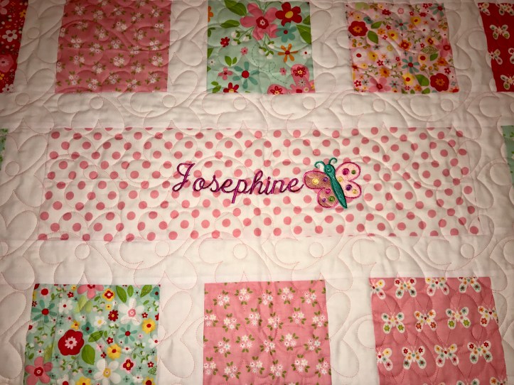 In the second row incit a 21″ x 6″ piece and embroidered it to match the fabric. The fabric is by Riley Blake and is a garden/flower/butterfly theme.