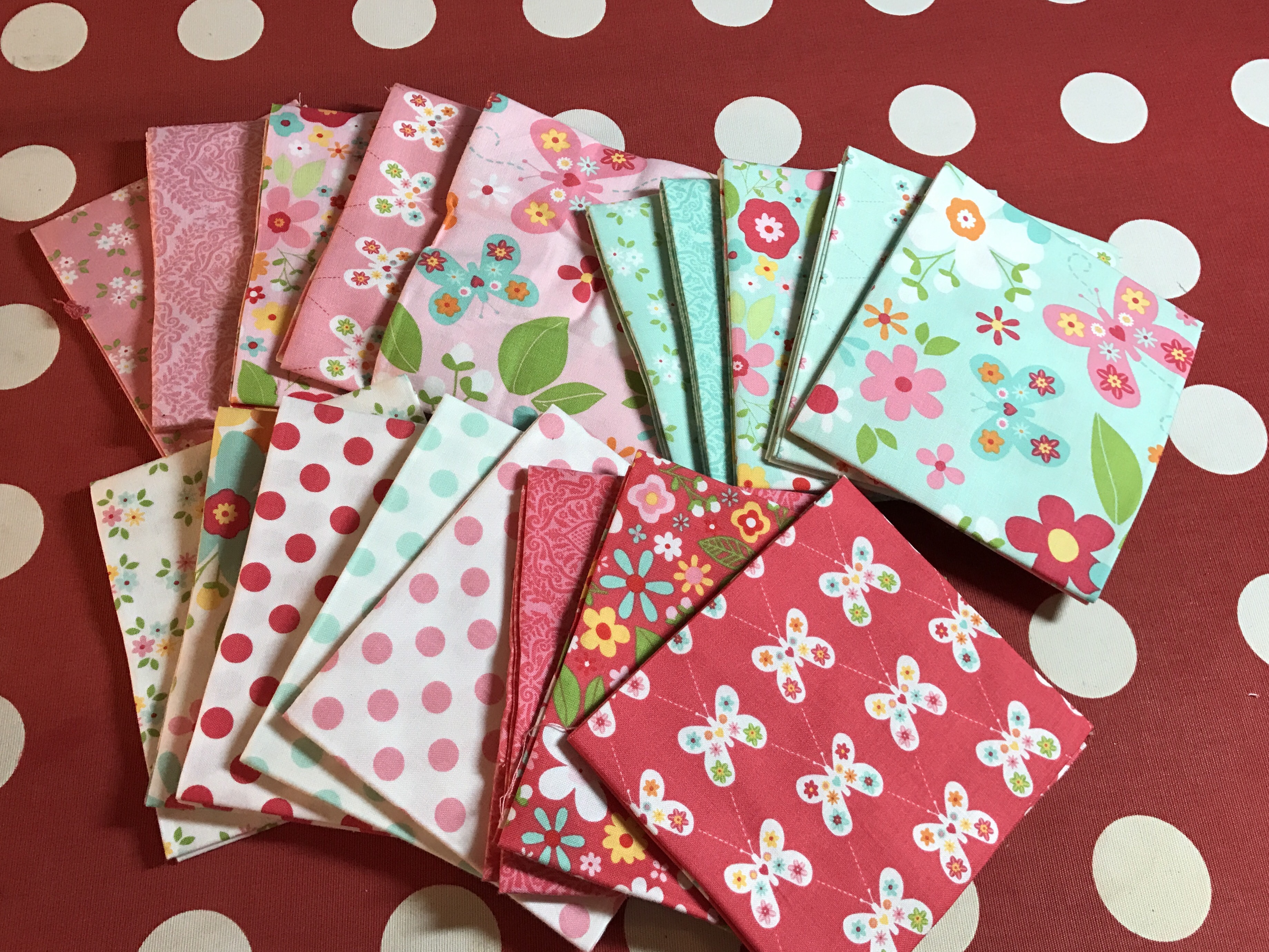 Looking at the fat quarter bundle, I spent a bit of time deciding whether to work across the palette or to do a single monochromatic color story. I went with the whole collection and cut up the whole fat quarter set so I can list it on my Etsy shop.