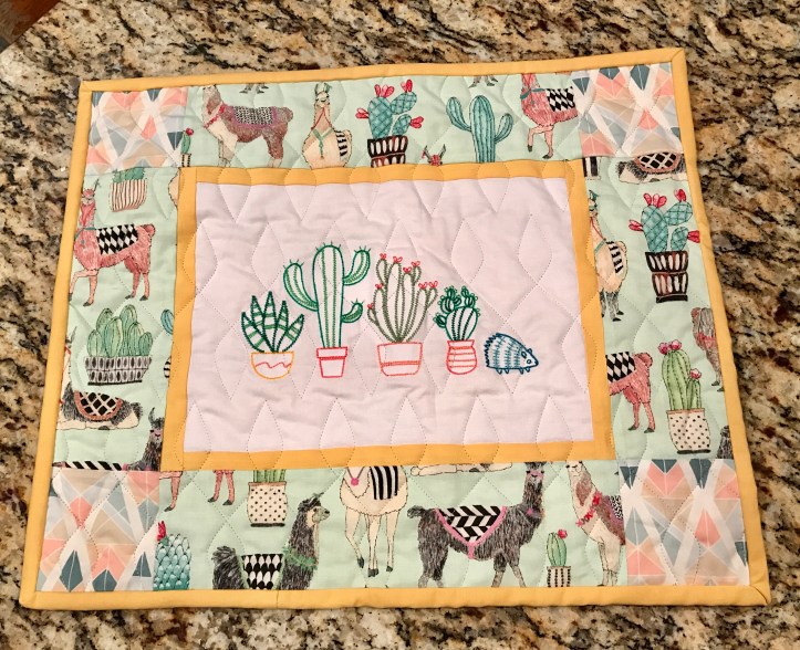 The last little mini is for Miss Maddie. She is all set up at RIT and her room has a cactus theme. Housing made her take down her cactus tapestry, so hopefully this sweet quilt will fit in. Plus, who can resist llamas?