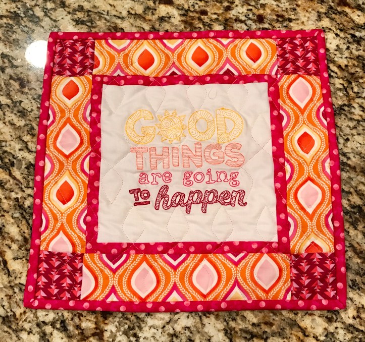 This one is for me. I just became CEO of the company I work for and have a lot of work to do. This mini will hang at my desk and I hope will be a positive affirmation. I love pink and orange together and the inner border and binding matchbour company color.