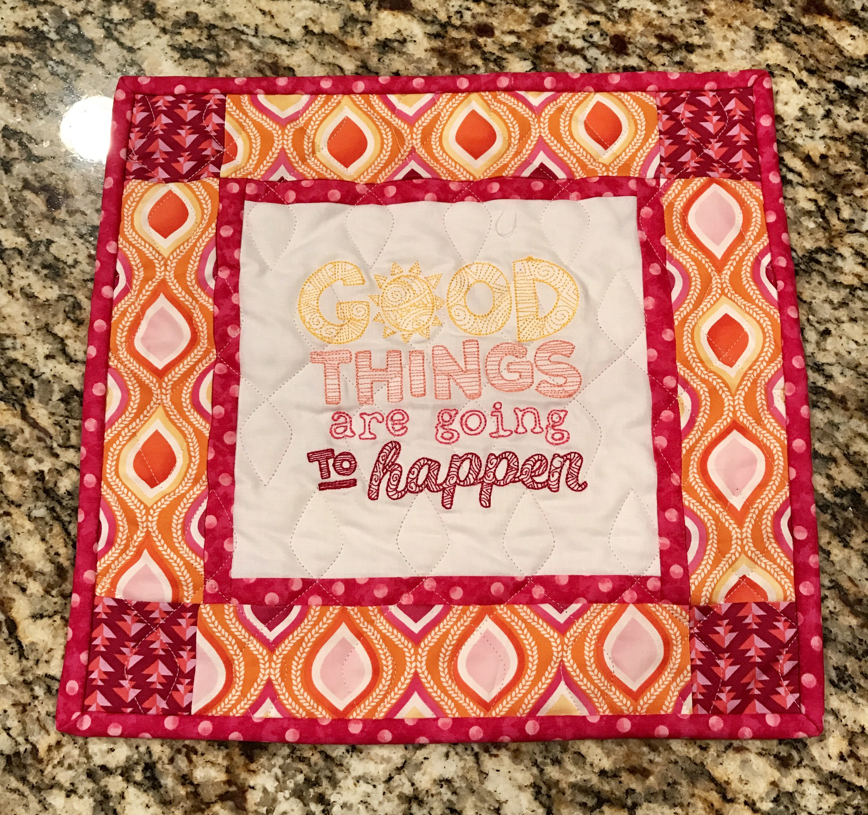 This one is for me. I just became CEO of the company I work for and have a lot of work to do. This mini will hang at my desk and I hope will be a positive affirmation. I love pink and orange together and the inner border and binding matchbour company color.