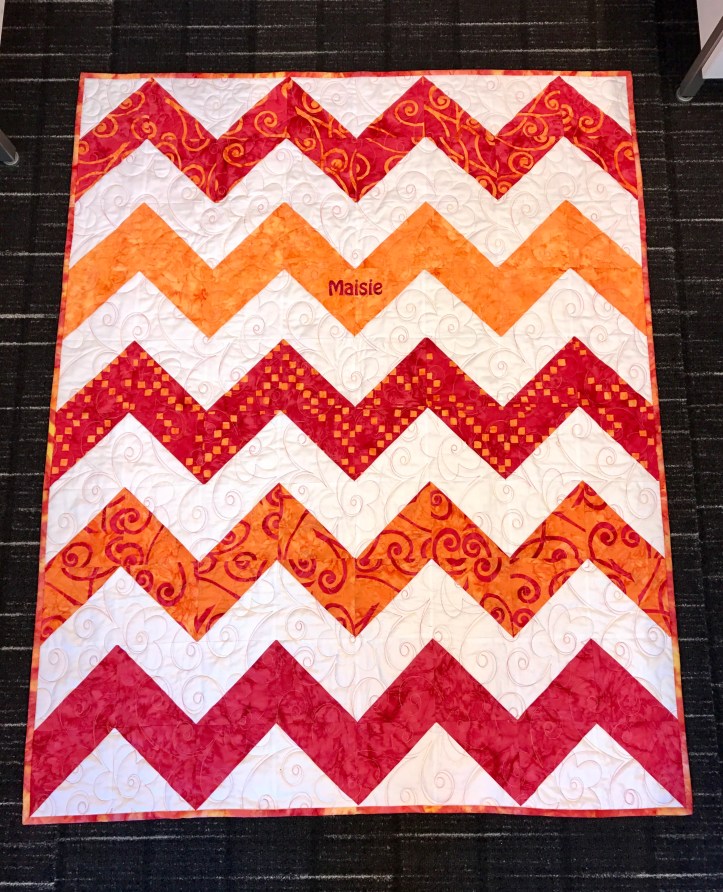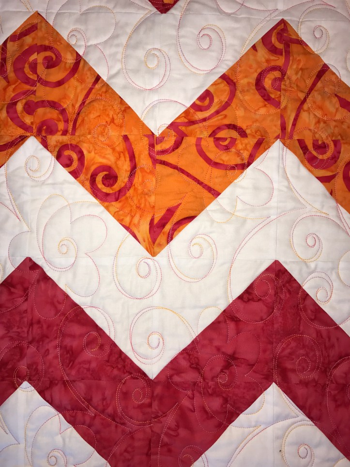 The quilting is a swirly flower that I love for this quilt as the swirls are a nice contrast to the points of the chevron. The quilting really softens the entire quilt in my view.