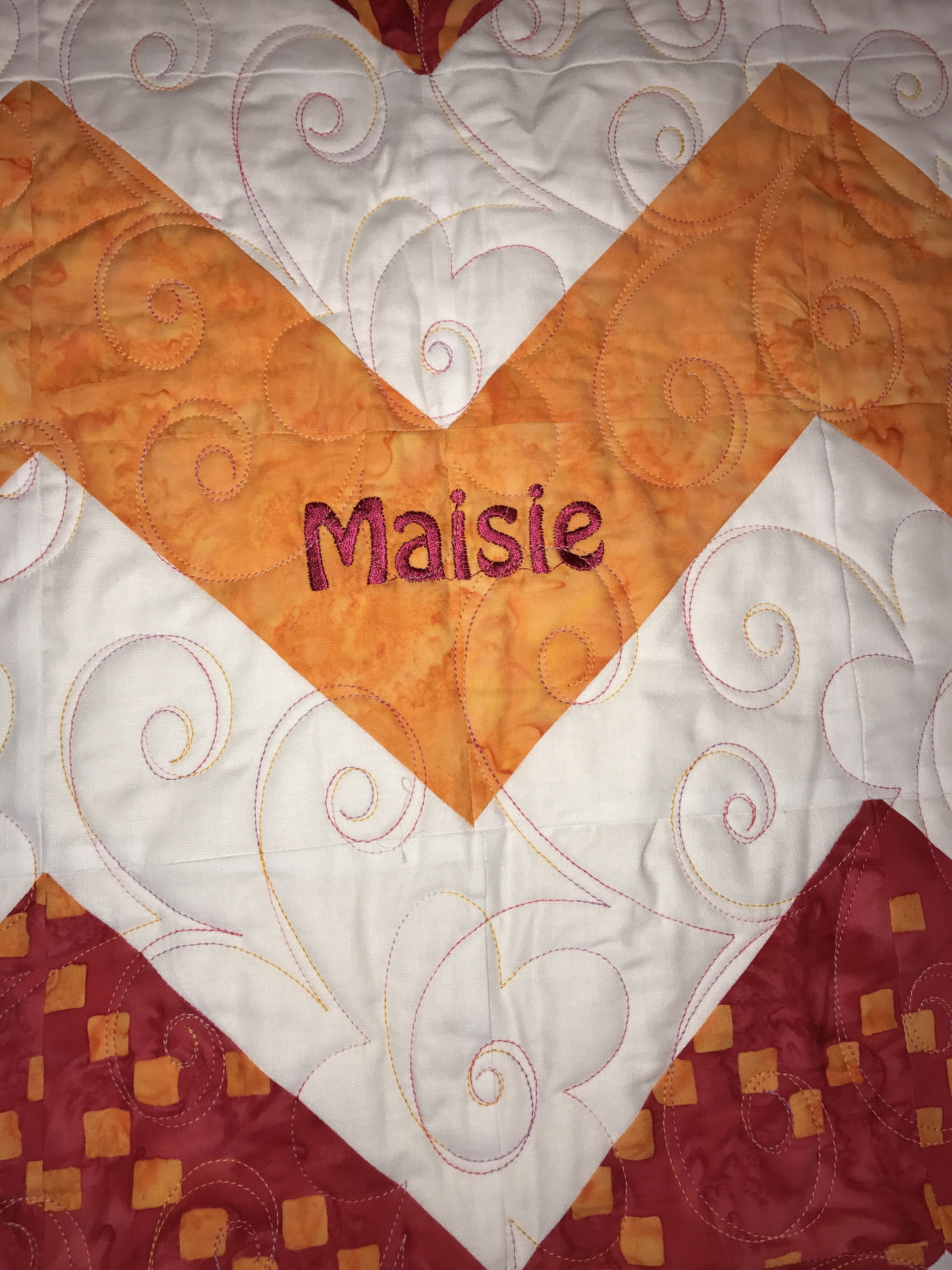 I am always torn about giving a baby quilt before the baby is born without a name, or after birth with the name embroidered. For me, the embroidery makes the quilt truly one of a kind, so I usually go that way. For this quilt I think it is the perfect touch. I sure hope Maisie enjoys her quilt in health and happiness!