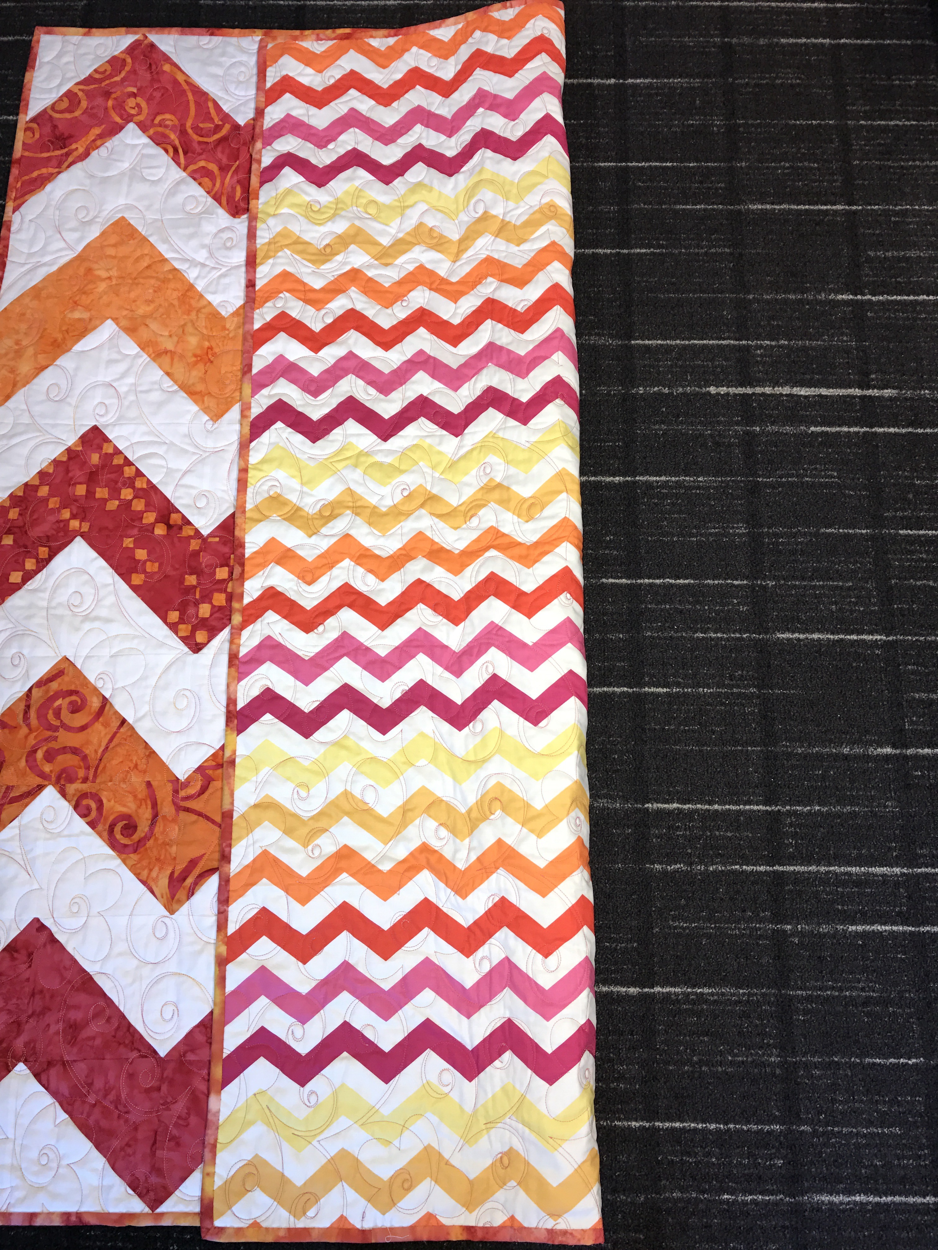 The quilting is a swirly flower that I love for this quilt as the swirls are a nice contrast to the points of the chevron. The quilting really softens the entire quilt in my view.