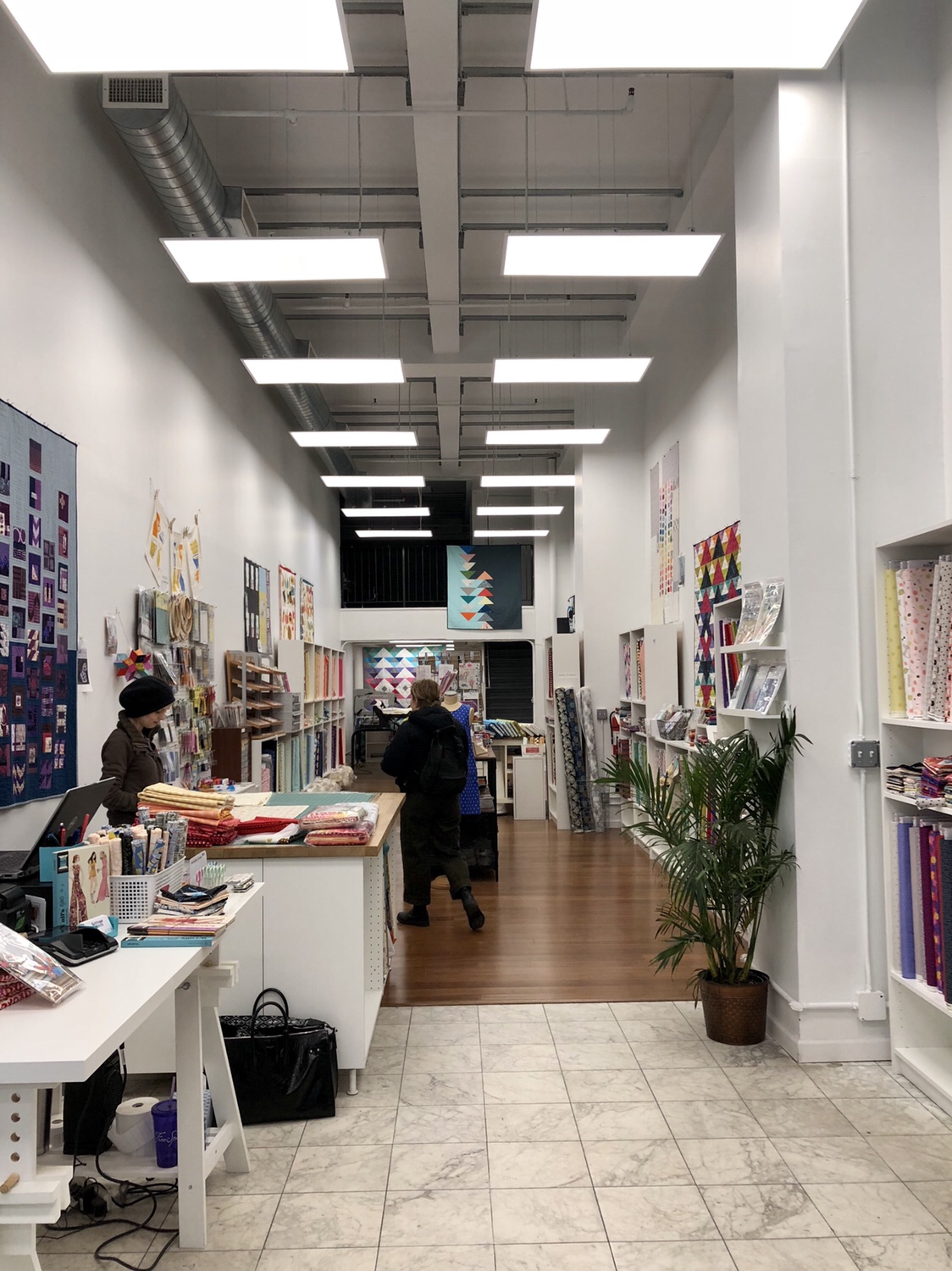 If you are in NYC, visit this shop. The team is lively and they have exquisite taste. They are some accommodating, even offering to cut a FQ from the bolt. They have Berninas, including service, and lots of other fun, slightly off the beaten path type products and ideas. I enjoyed it so much I may even be looking forward to my next meeting at my parent company! 😀 I loved City Quilter and was so sad when it closed, but I think I may end up loving this shop as much, if not more.
