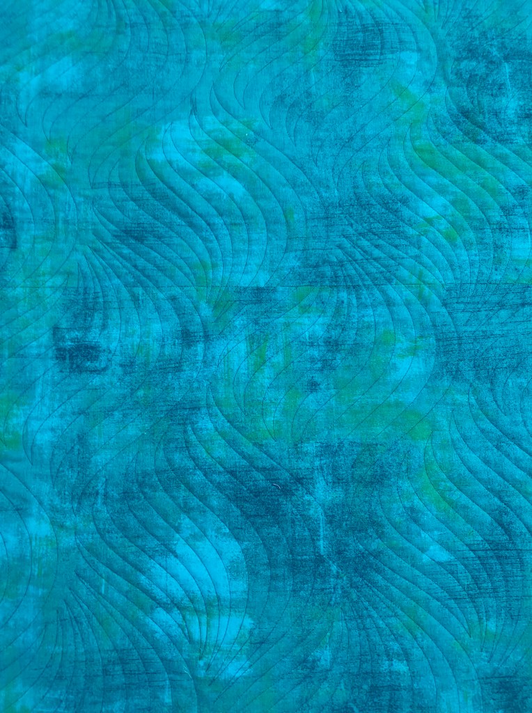 I used Moda Grunge Dynasty for the back and the binding as I wanted to dial up the green and show off the quilting. Plus, I include some grunge in almost every quilt. 🙂 I quilted it with Fusion by Urban Elementz stitched to 15 inches and used King Tut De Nile variegated thread. I wanted to see texture on top, so I resisted my original urge to use lime green or neon pink. Here is a shot of the quilting from the back.