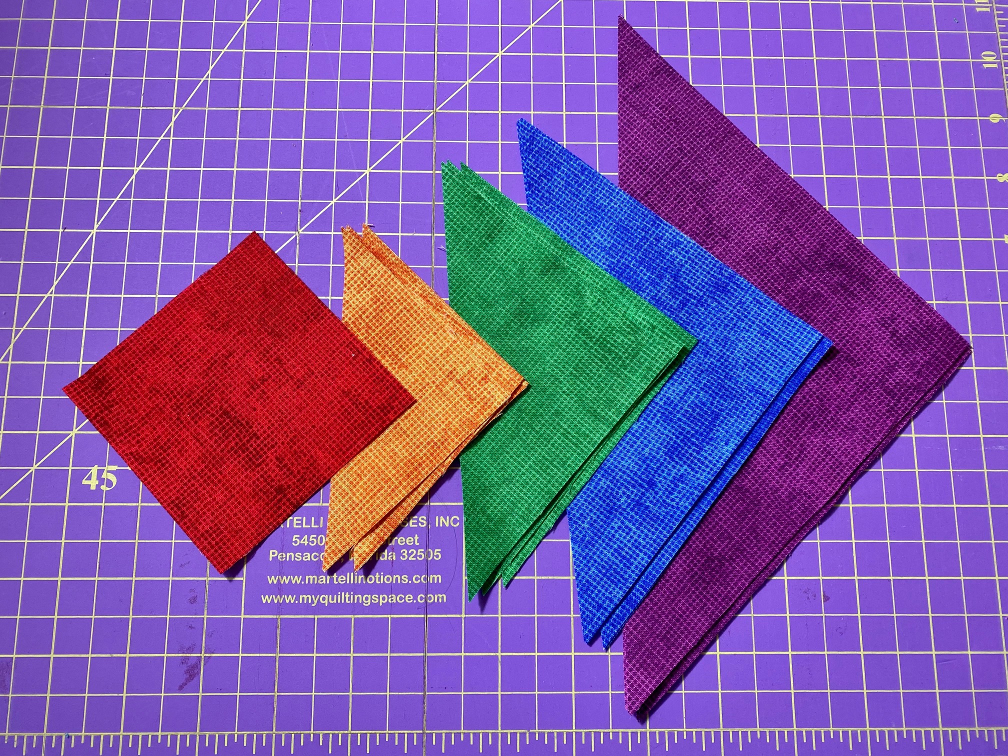 From each fat quarter cut (1) square that is 6.5″ x 6.5″, (2) squares that are 5.5″ x 5.5″ and (2) squares that are 7.5″ x 7.5″. Cut each of the 5.5″ and 7.5″ square diagonal to create 4 triangles of each. These pieces will make 12.5″ blocks.