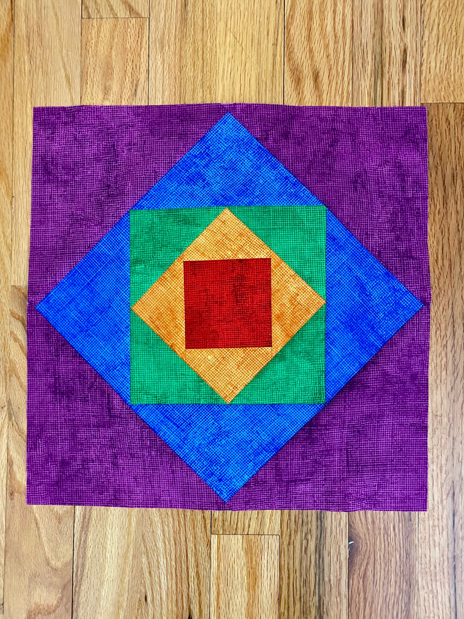 These blocks are so much fun to make that I did another with a 6.5″ economy block as the center square and added the outer triangles to finish it at 12.5″. I might keep adding to it to see how it looks. The possibilities are endless and if you use different fabrics for the outer triangles you can create awesome secondary patterns.