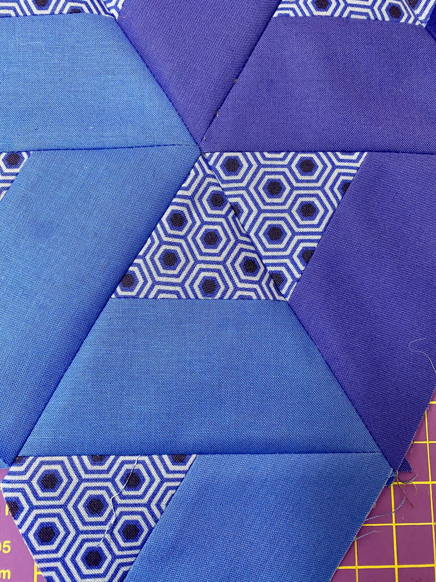 I love the hexy diamond this block makes and it is very striking through the block…I thought about trying to find a way to match the hexies but then my head started to hurt. LOL.