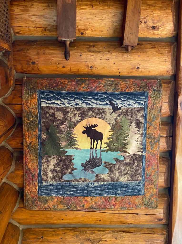 There is a charming sitting area between the bar and the restaurant. This appliqué moose was right at home and popped in the setting. I love the moose in front of the sun with the shadow in the lake.
