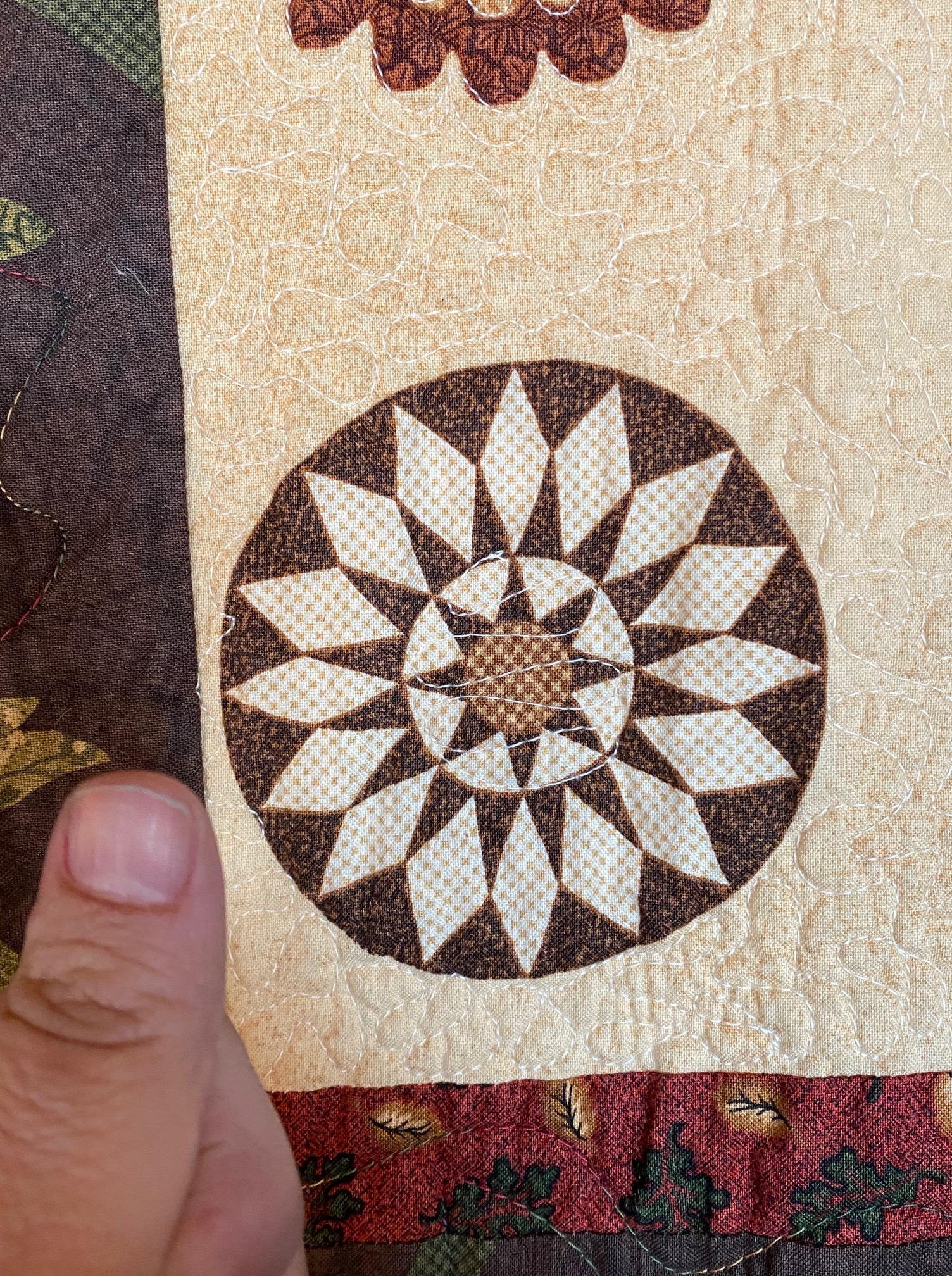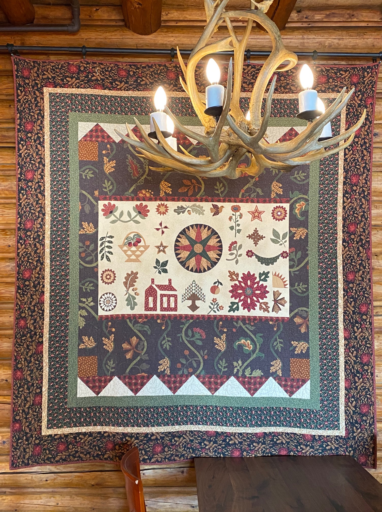 This quilt was in the dining room. At first glance I was amazed at the detail and even put my finger up to it to show the scale of the small pieces. Only then did I realize that it is a panel. No mind, it is still gorgeous and fit the setting perfectly.