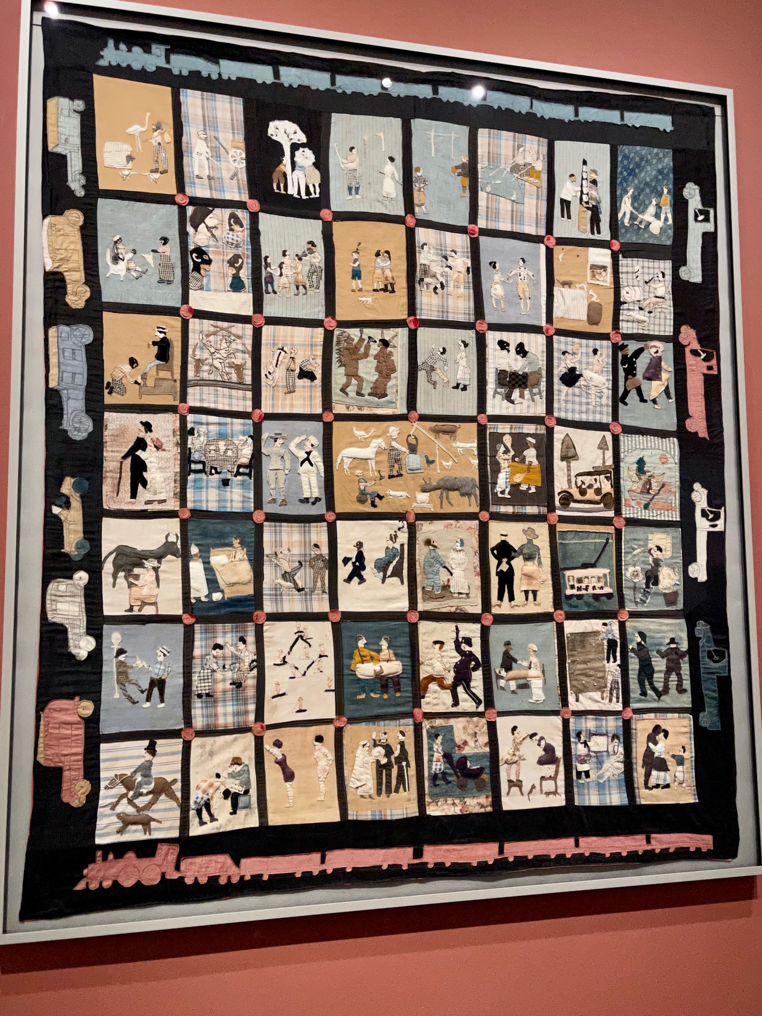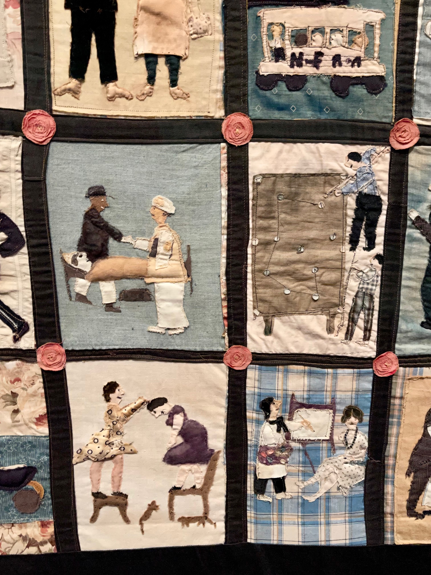 This quilt is called Scenes of American Life and was possibly made by Mrs. Cecil White from Hartford, CT around 1920. I thought this was absolutely fantastic with 55 snapshots of life in America appliqued onto the blocks. They are simple in design, but yet have detail to bring them to life, ie. the stitching to show the path of the balls in the the billiards block above. Outside the charm of the blocks, there are some biases depicted including class and racial stereotypes of the time, that are disturbing today. Many of the activities shown would be different today, and I would hope the character depictions would be as well.