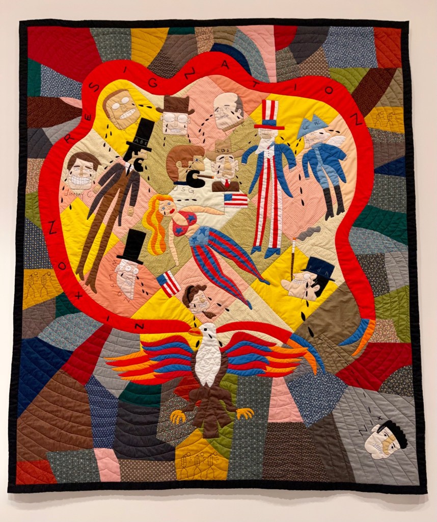Nixon Resignation was made by Edward Larson of Liberty, IL and quilted by Fran Soika of Novelty, Ohio in 1979. It features traditional piecing, applique, embroidery and quilting. Larson is known for his story quilts and he worked with many different quilters to bring his ideas to life. For this project, he gave Soika freedom and flexibility to add quilting and embroidery as she saw fit. According to the description, “The first president to resign, Nixon floats away from the others, in the darker margin where stick figures bow their heads and cry.”