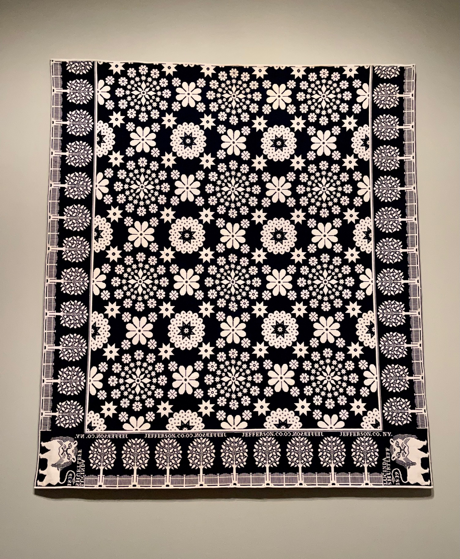 The first coverlet was made by Harry Tyler from Jefferson County, NY in 1839. It is woven as opposed to quilted, but I thought the center was very modern for the time. I could easily picture this design as a top-selling applique pattern today. This was a very popular pattern of the time, and this version was appliqued. In later years mills printed this fabric so the top could be created with less work. The placard suggested that this was a special occasion quilt. The second, Carolina Lily, was made by an unidentified maker between 1830 and 1845. The third is a Rio Grande blanket from an unidentified maker from New Mexico in mid-19th century. It is a wool tapestry weave with dyed wool to create the blue color.