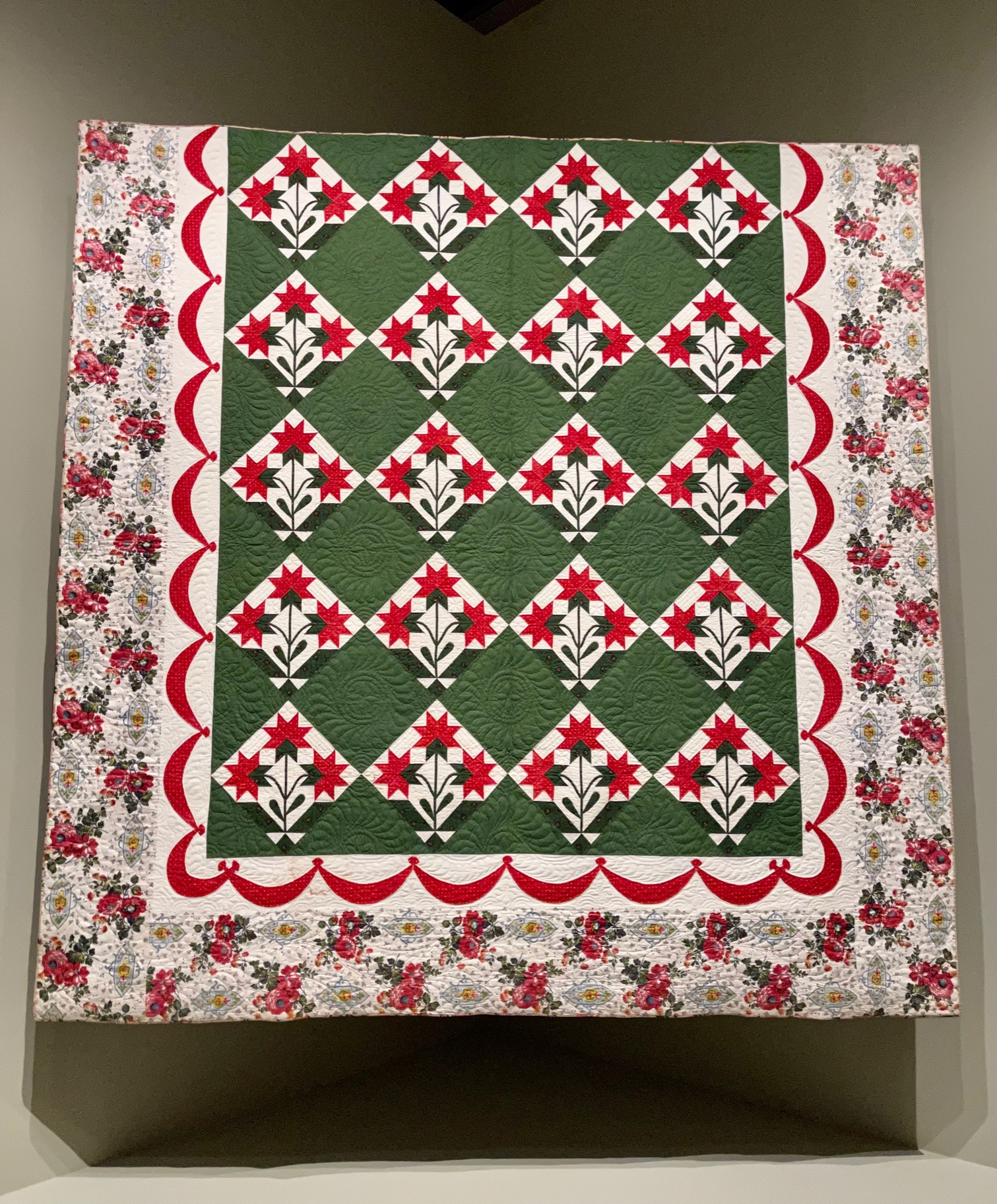 No, your eyes aren’t deceiving you! Agusta Agustsson of MA made Blanket of Red Flowers in 1979 to hang in Boston City Hall as part of an exhibit of women artists called Throbbing Needles. The quilt was banned and later hung informally by members of different quilt and design groups. Her intent was to explore sexuality and if you look carefully will see that women’s genitalia are also shown. I found it interesting as I have been working on some three-dimensional quilts lately. Don’t worry, mine aren’t this exciting.