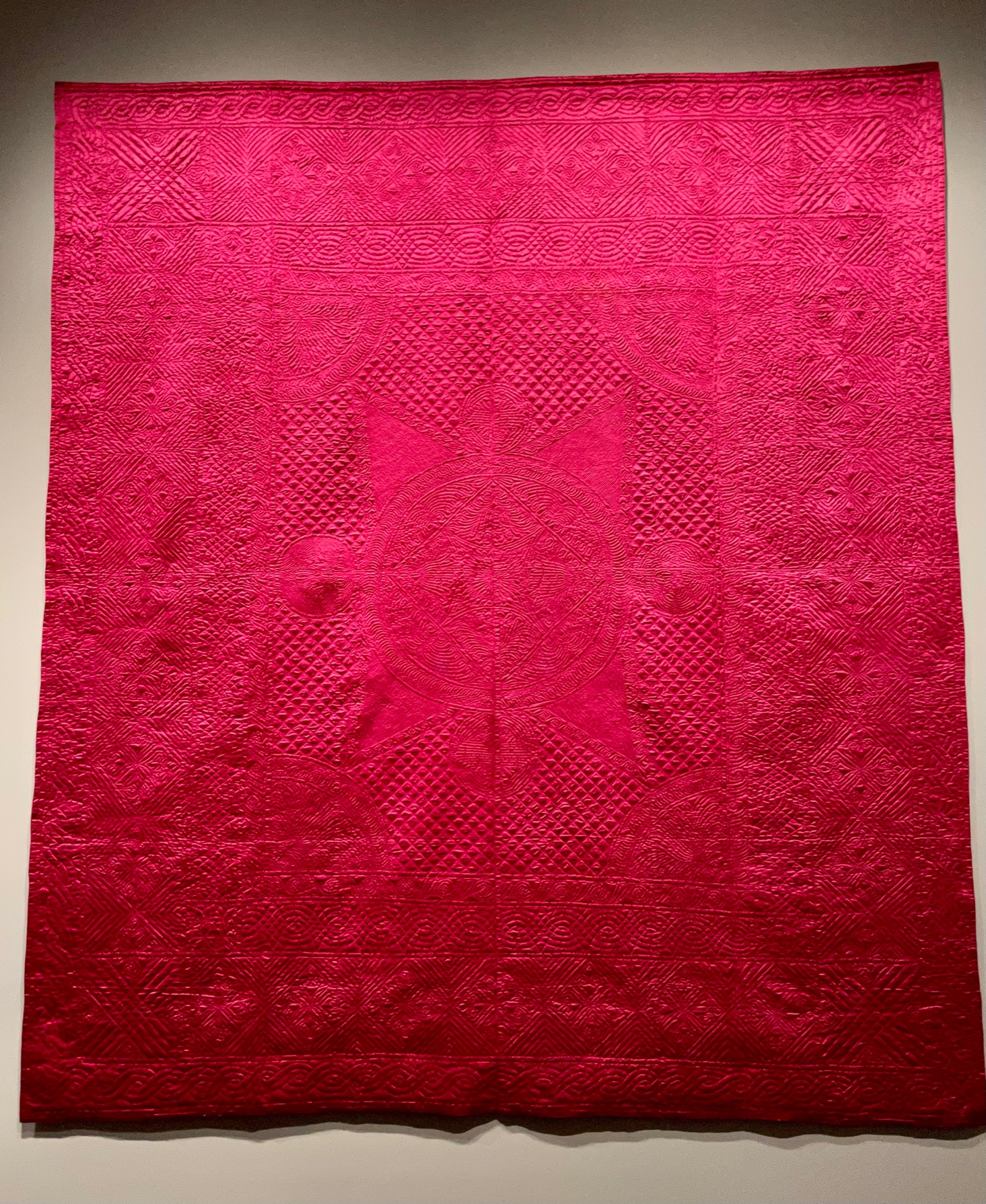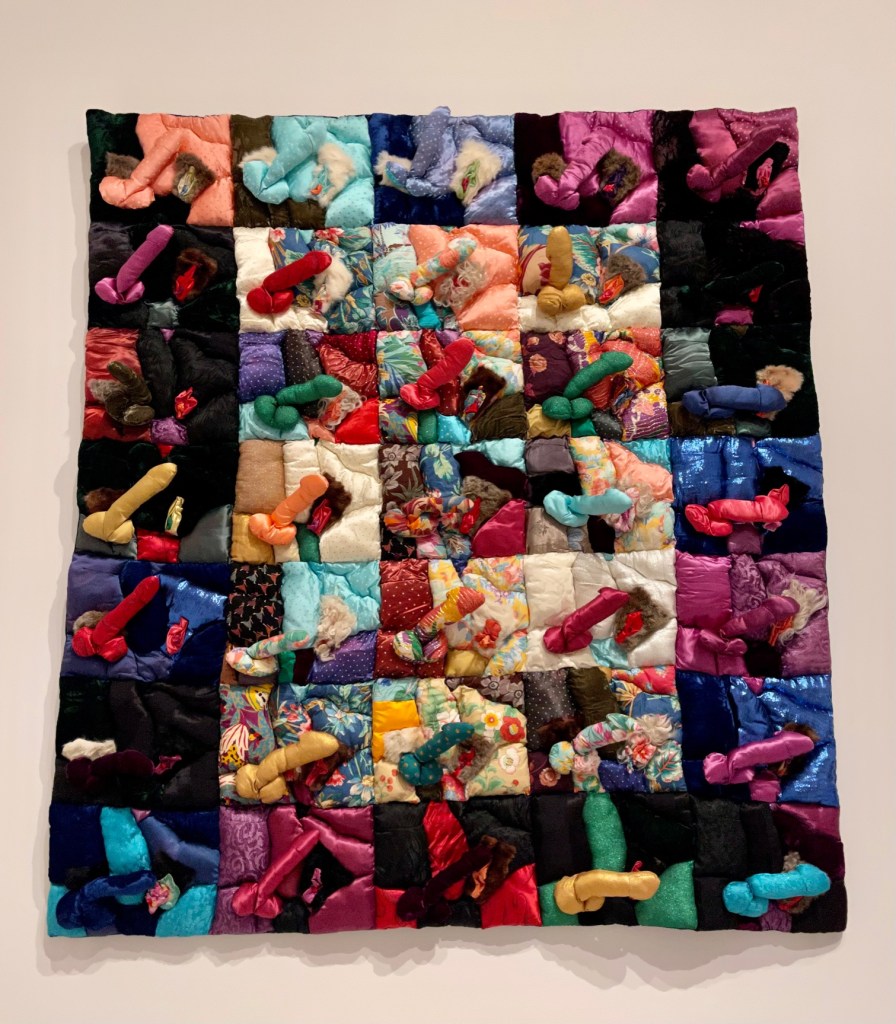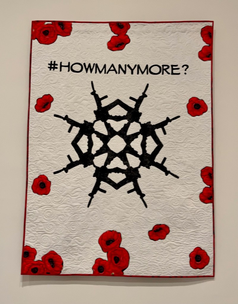 The hashtag and subject matter give this quilt away more recently made and the subject couldn’t be any more urgent. #howmanymore was made by Sylvia Hernandez of Brooklyn, NY in 2018 in response to the school shooting in Parkland, Florida. This quilt is said to be a “memorial to the victims and a protest against gun violence.” I found it very powerful.