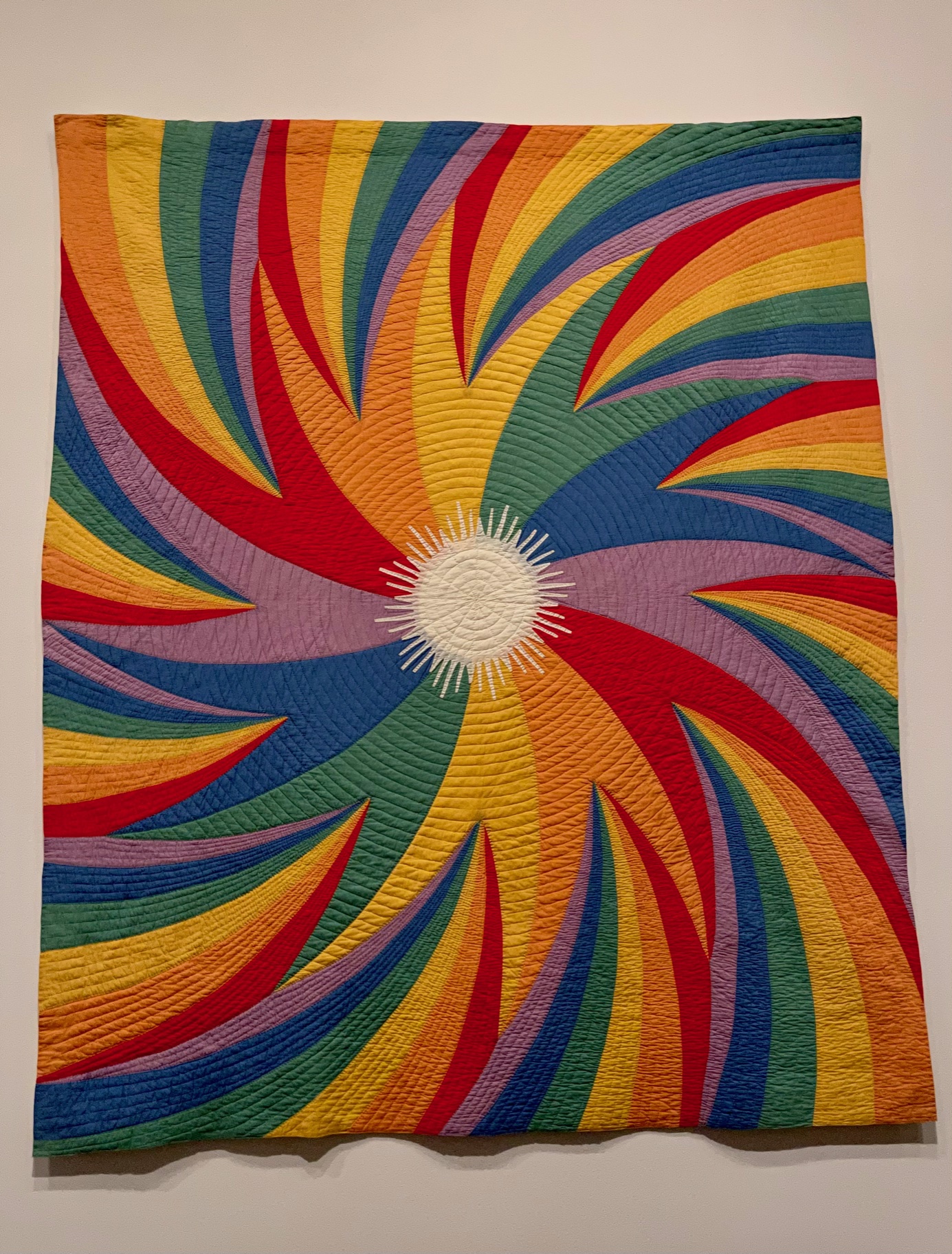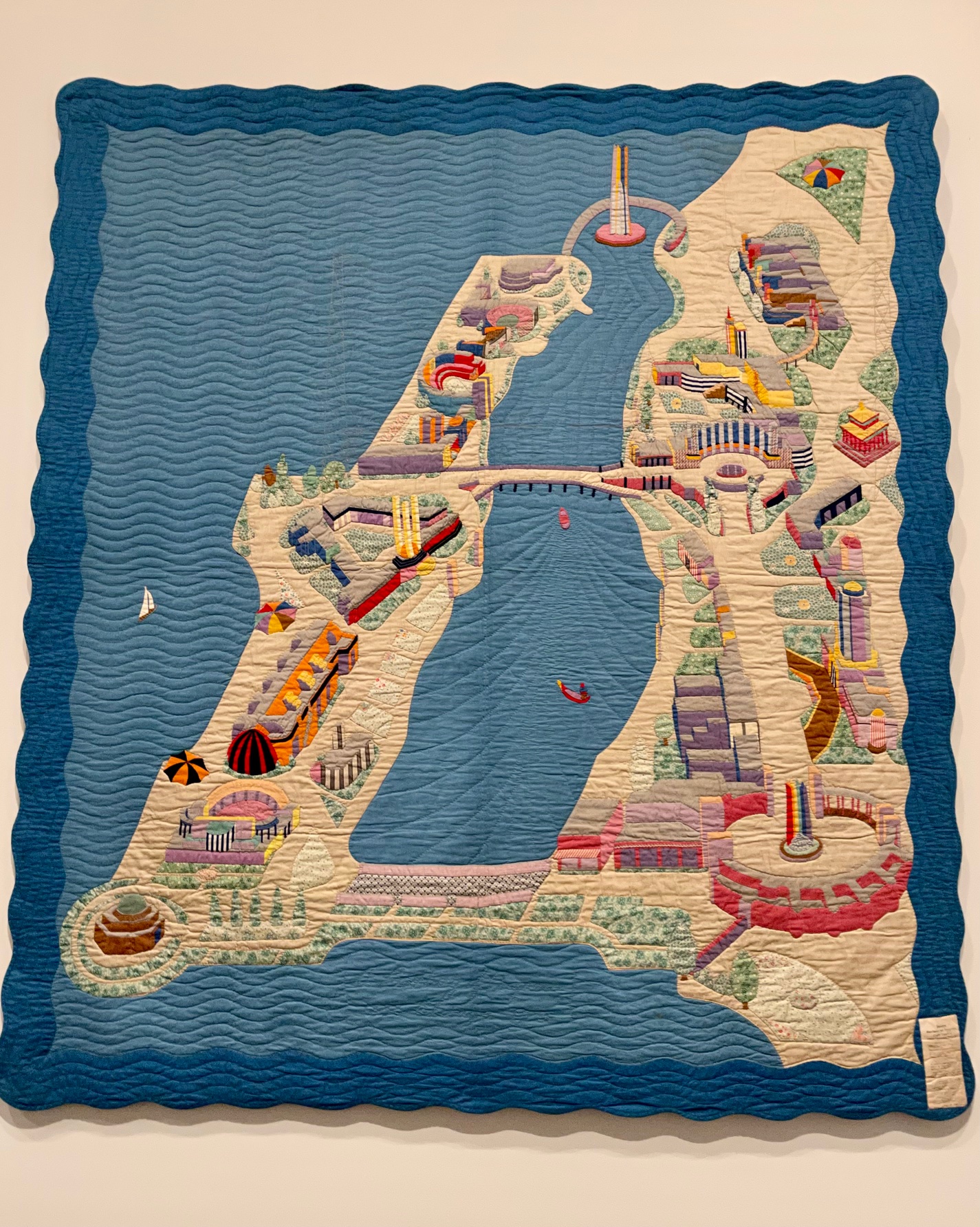 Coastline by Susan Hoffman (active in Boston, NY and CT) was made in 1975 of cotton, polyester, silk, velvet and wool. It was machine pieced and hand quilted and is stunning. A self-taught quilter, Susan creates large-format pieces to raise awareness of social causes, recently having a quilt included in the Migrant Quilt Project that builds awareness and empathy for those trying to cross the Mexico/US border.