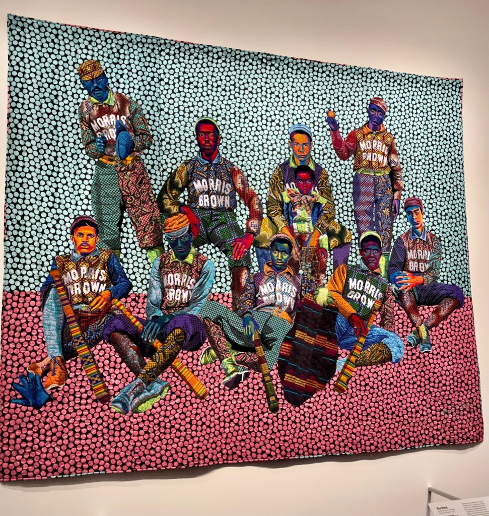 To God and Truth by Bisa Butler of Orange, NJ was made in 2019 of cotton with traditional piecing and applique and quilting. She used thousands of pieces of fabric to create the image based on a photo from the Morris Brown College baseball team. The men shown are life-sized and the detail is amazing. The placard speaks of how she wanted to honor their individuality and explore they skin tones and features. It mesmerized me for several minutes.