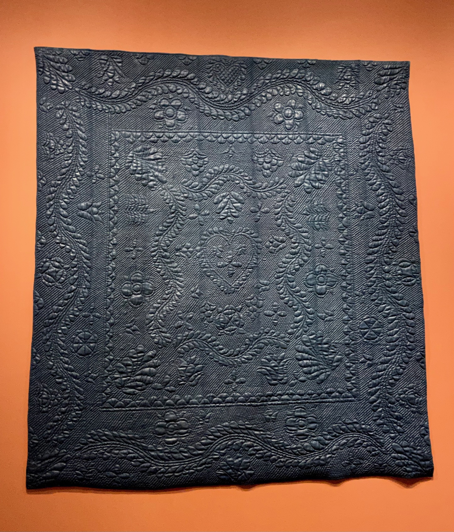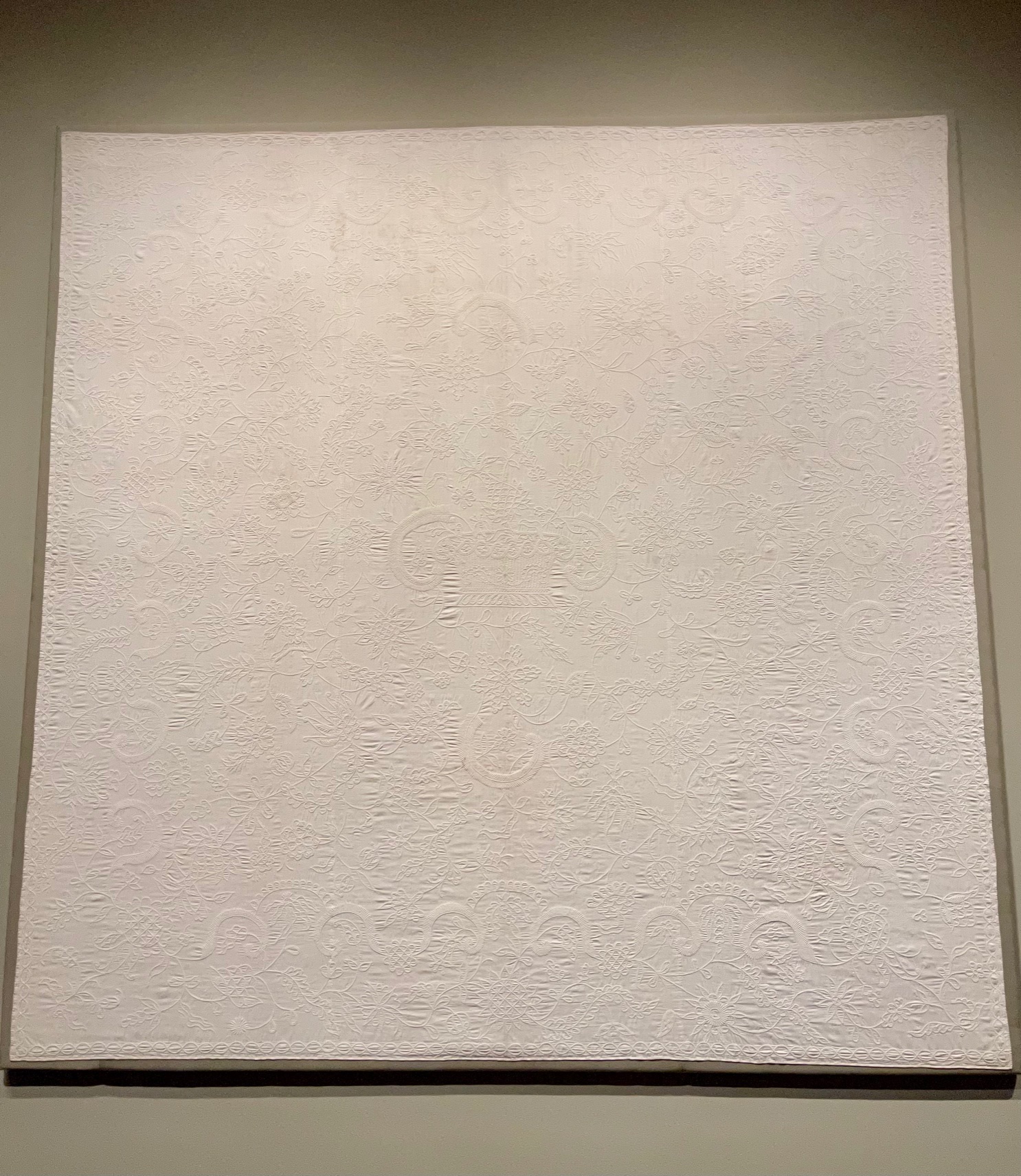 These three whole cloth quilts were stunning. The red is from an unidentified maker in England in the late 17th or early 18th century. It is a silk satin and would have been considered a status symbol to have a quilt like this during that time. The white version was made by Eunice Dennie Burr from Fairfield, CT in approximately 1790. It is thought that she made this quilt to replace one destroyed when British troops invaded Fairfield in 1779. This hand quilting has 22 stitches per inch. I can’t even, and am sorry the photo doesn’t do it justice. The blue quilt is also from an unidentified maker from Connecticut and/or Western Mass between 1750-1800. The stitching features a medallion surrounded by borders with leaves and flowers. It couldn’t be more stunning, and of course I want to do a whole cloth quilt for my bed now.