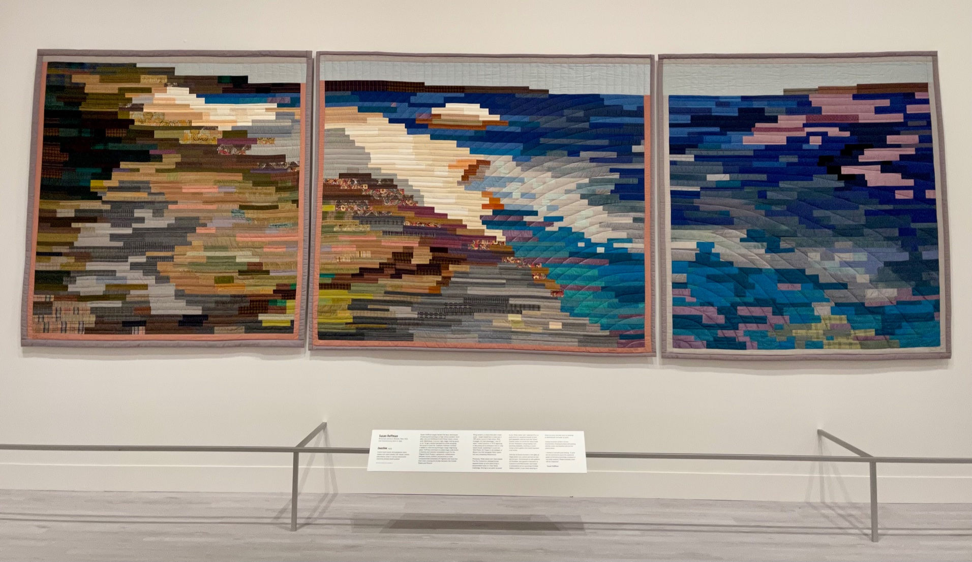 Coastline by Susan Hoffman (active in Boston, NY and CT) was made in 1975 of cotton, polyester, silk, velvet and wool. It was machine pieced and hand quilted and is stunning. A self-taught quilter, Susan creates large-format pieces to raise awareness of social causes, recently having a quilt included in the Migrant Quilt Project that builds awareness and empathy for those trying to cross the Mexico/US border.
