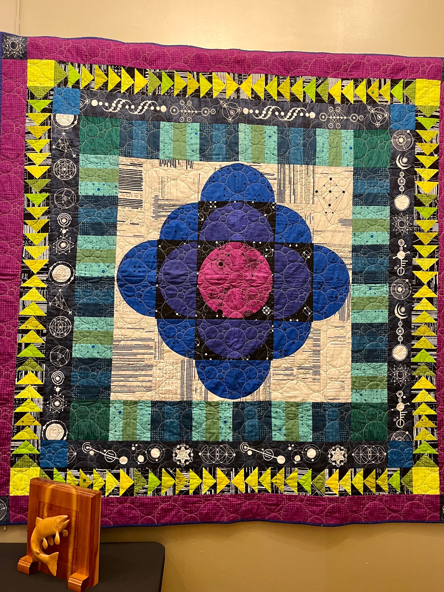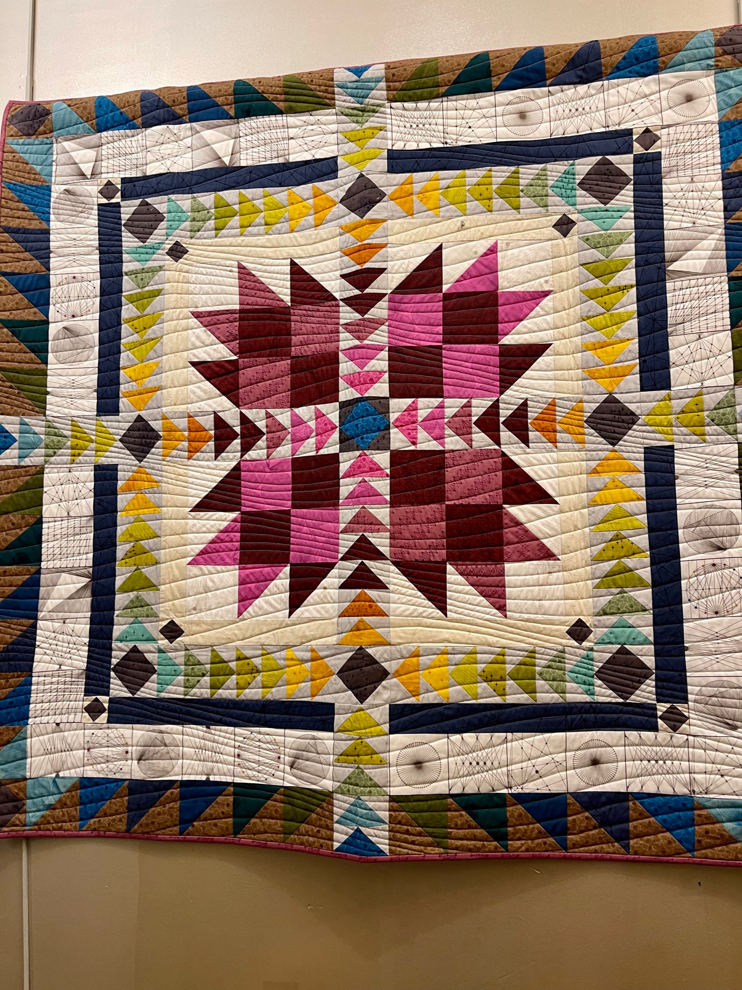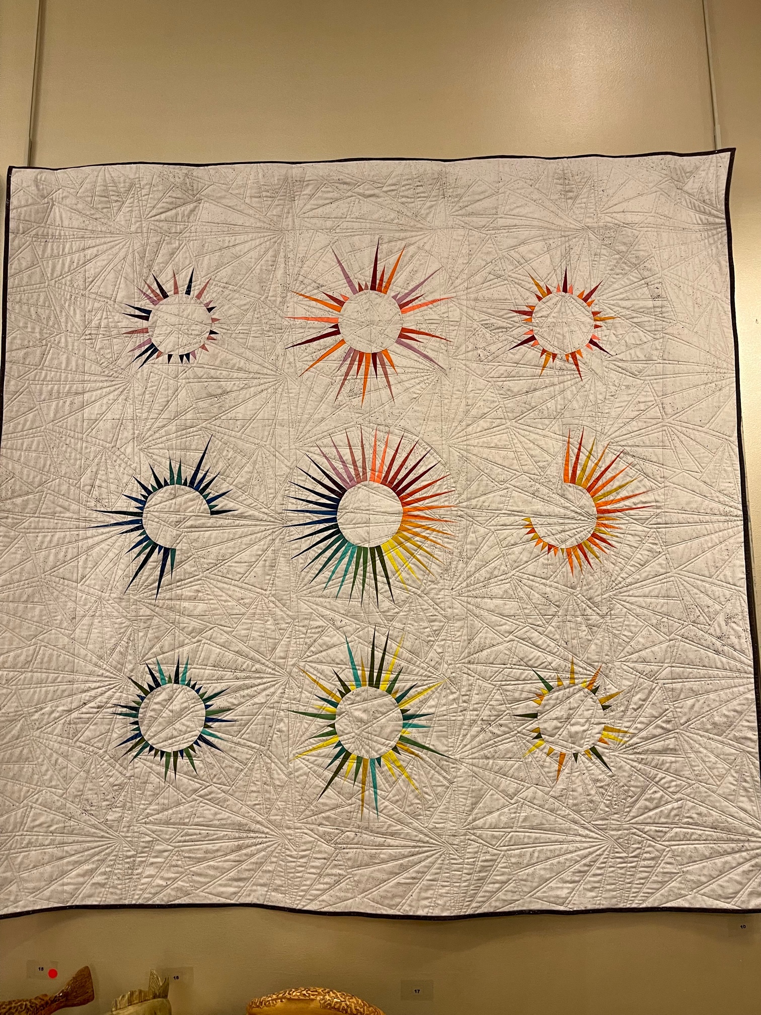For this exhibit Giuseppe chose to show only quilts that he made from his own fabric. You can see a beautiful range, but they are all true to his bold, colorful and modern style of quilting. From L-R, top row: Between Worlds, Particle, RE, Canyon Road