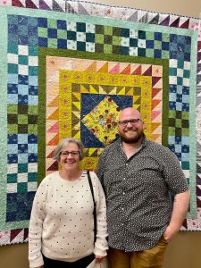 The quilt shown here, Francesca’s Garden, was the recommended project from the Nonna fabric line. Peggy made this quilt, and we were fortunate enough to quilt it. It was fun to get a photo of Peggy with Giuseppe in front of his version of the quilt.