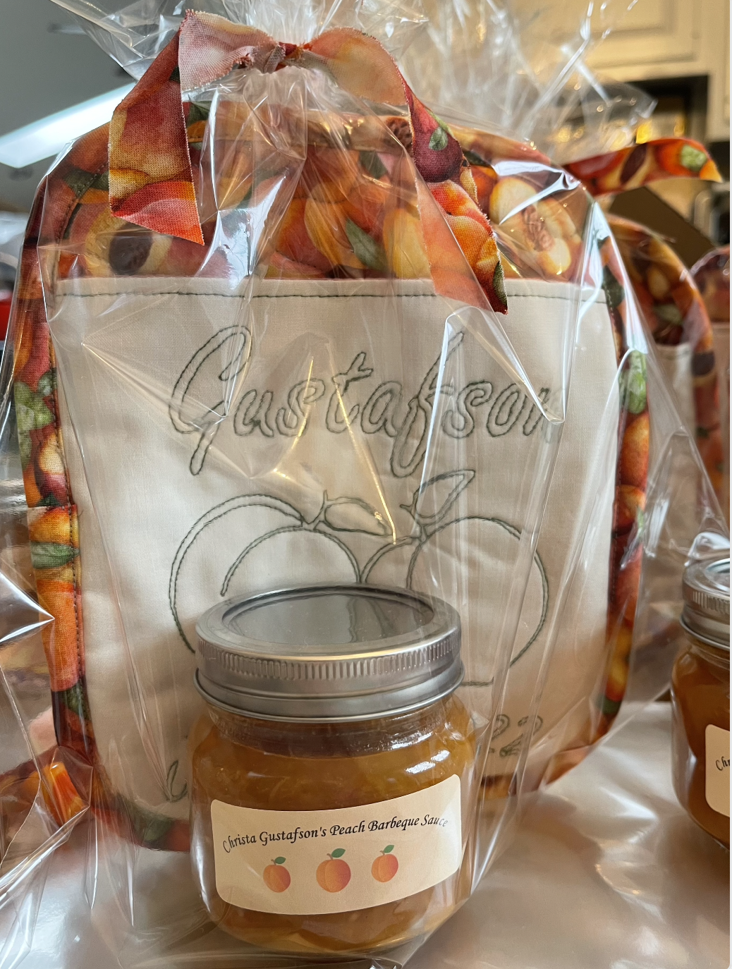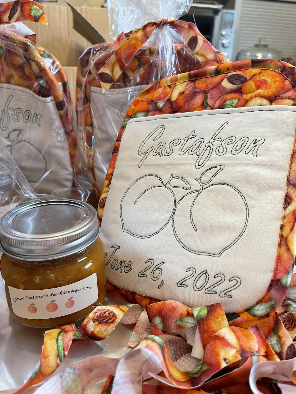 So cute! These awesome pot holders on their own would have been a fantastic shower gift. But Sharon, I have learned, is an overachiever. Why just provide a custom sewn, on-theme pot holder when you can make peach barbecue sauce too?