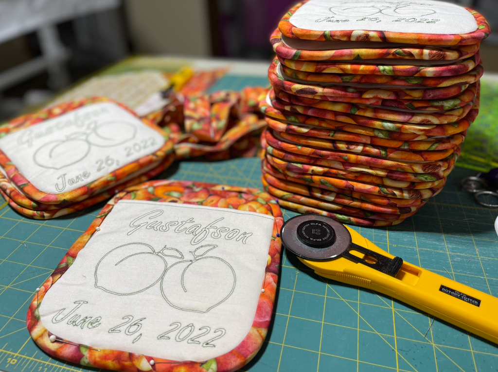 Sharon’s creativity knows no bounds and she had the idea to make pot holders – but not just any potholder! These would have peach fabric and a custom quilted design.