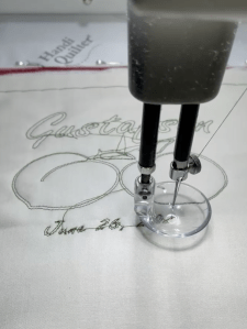There are lots of posts these days about doing embroidery on your longarm (something I personally don’t do or recommend, as cool as it may be.) For Sharon’s design, I worked with her to create the design using Pro-Stitcher Designer. It was super easy to digitize a graphic and add text. I should have spent more time on the thread stops but we were on a deadline!