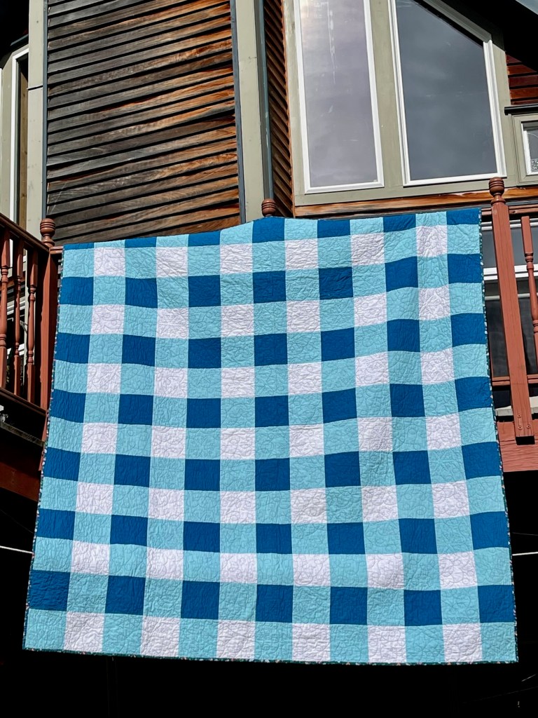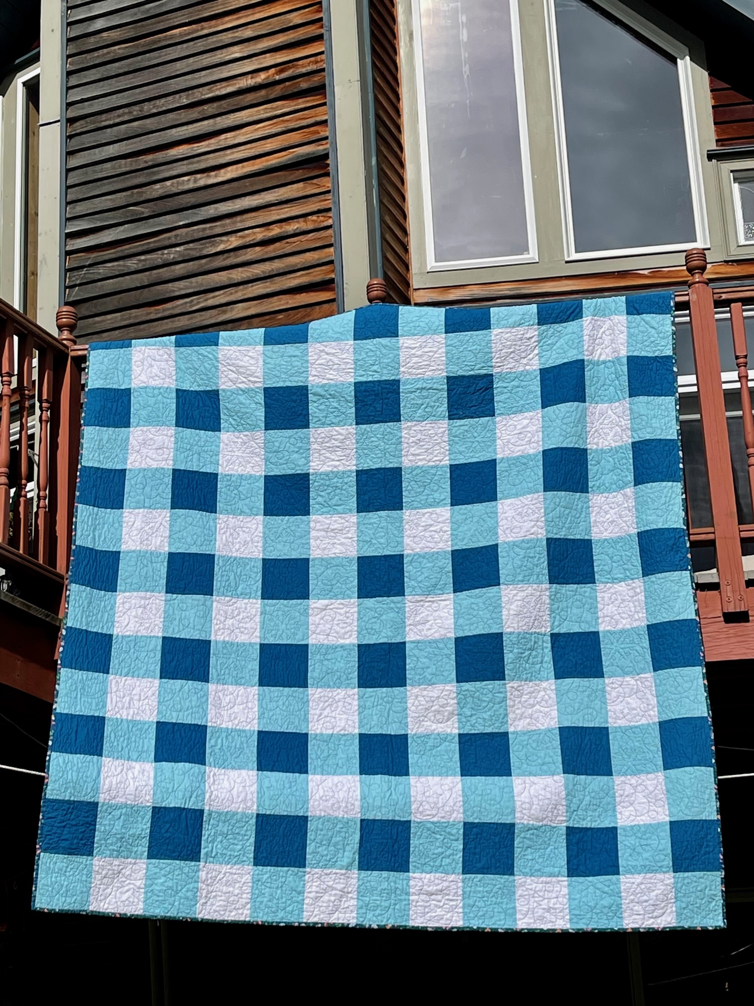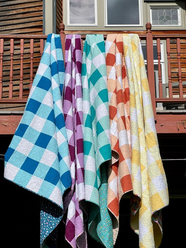Each quilt was based off of a fabric from Lewis and Irene’s Whatever the Weather Line that featured small scale icons of each season on a different colored back. The tops are a buffalo check featuring Robert Kaufman Kona Cotton Solids. There are two twin quilts, two full quilts, and one queen. Here they are, and how to make them if you like any of them.