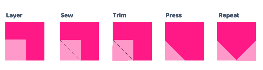 Layer a light 3″ square on top of a dark 5″ square, right sides together, aligning one corner with the other corner being on the center of the 5″ square.
