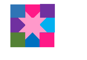 Once you have made your 12 star point units, assemble 3 stars by using 4 medium or dark 5″ squares for the corners, 1 light 5″ square for the center and 4 star point units.