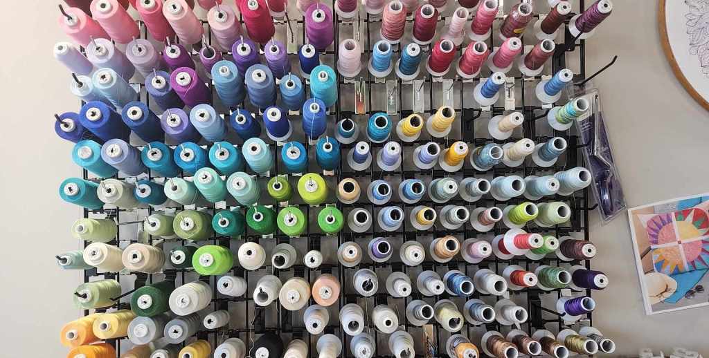 Thread is pretty to look at and sometimes if you see a color you may be motivated to try it on your quilt. In our shop we use grid wall, but you can just as easily use peg board and hooks. Peg board is readily available at hardware stores, is easy to install, and won’t be visible once you cover it in thread. 🙂