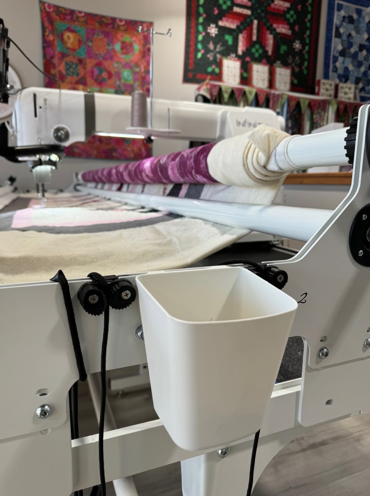 Sunnersta is a small container with a plastic hook that fits perfectly over your longarm frame. Use this little bin for your thread scraps, lint, and other irritants to keep your frame clean.